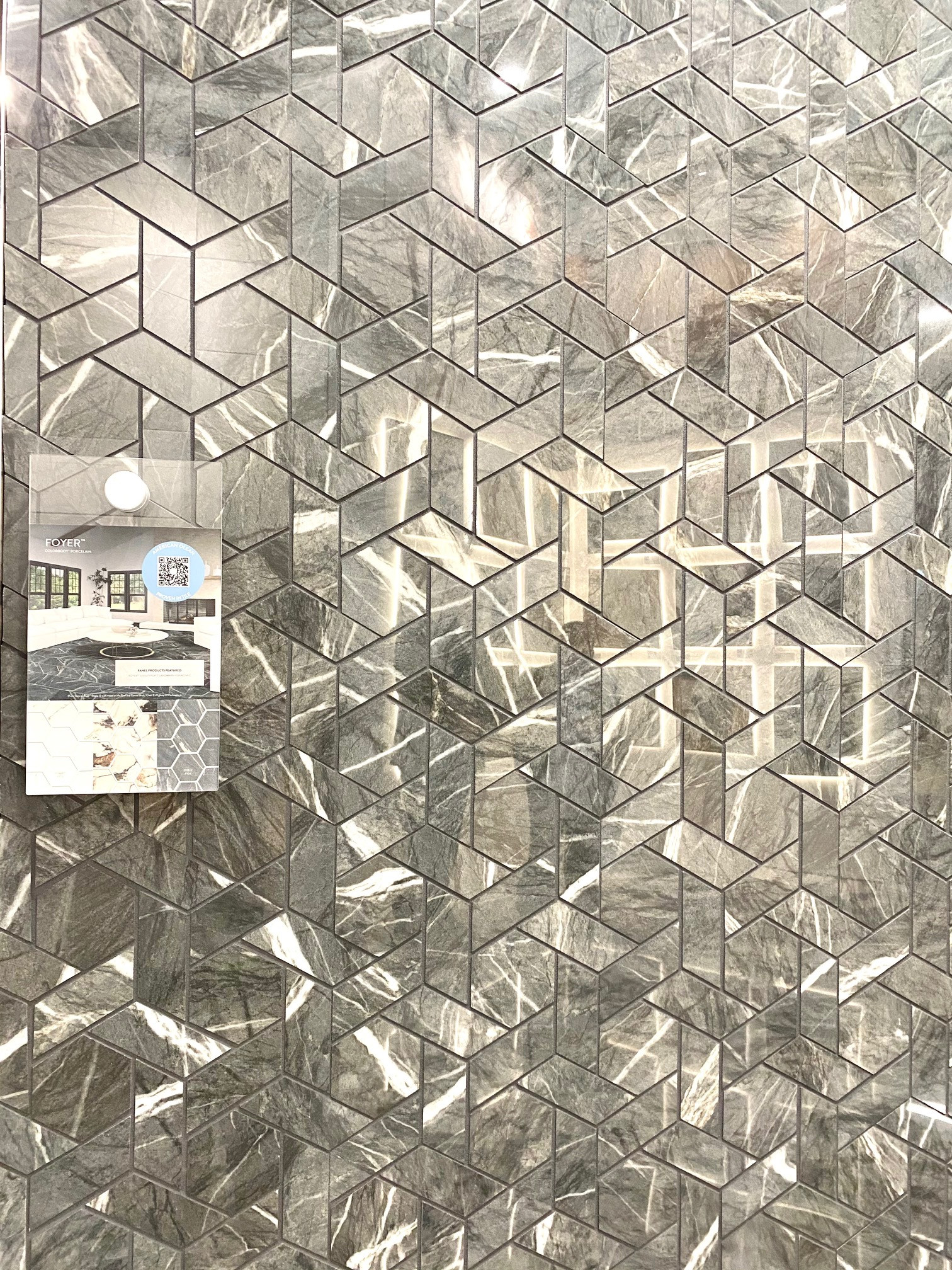 This shimmery display is the 3-inch Landmark hexagon in Steely from American Olean’s new Foyer collection.