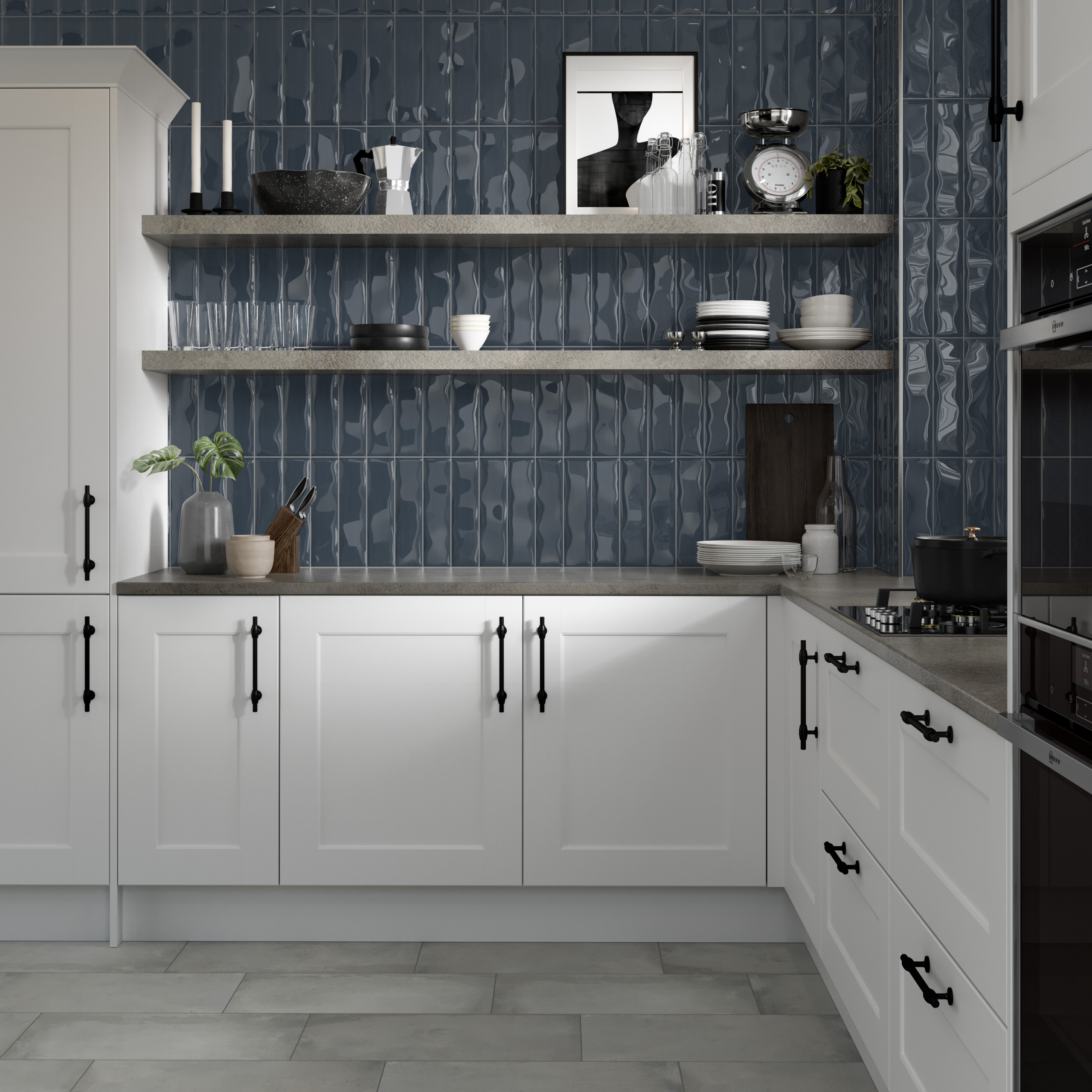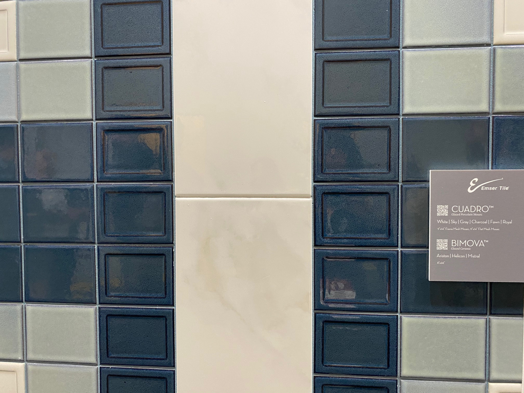 Emser’s Cuadro tile has the option for a raised frame surface reminiscent of a Shaker door, in addition to a flat-surface choice. The porcelain mosaics come in six muted colors, including Royal (frame and flat) and Sky (flat) shown here.