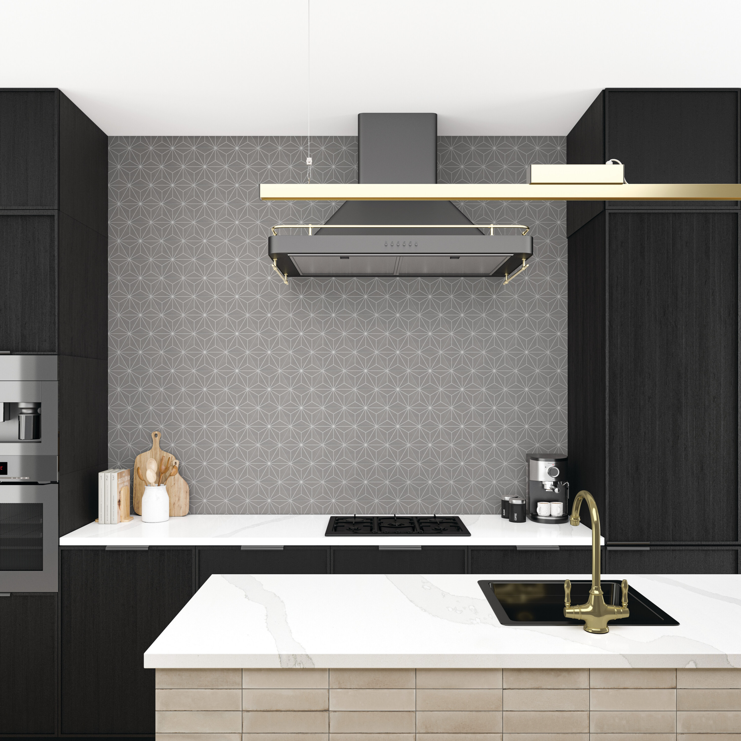 Daltile’s Scrapbook tile in the Asanoha pattern in Memory Grey is used here on the backsplash.