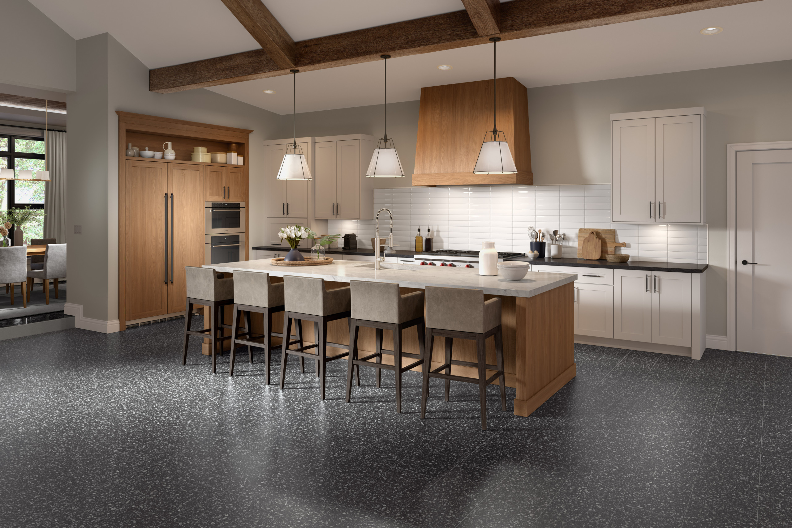 “What’s nice about this is it comes with a variety of different styles,” Greene says. “We have looks that are all meant to tie in with one another. They all pick up the tones of one another. If you like the greige in the terrazzo look but you like this other wood look, you can coordinate with one another. So it’s a real easy way to put it all together and have that designer look.”