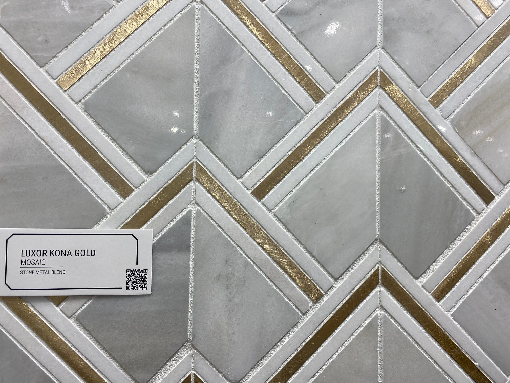For the gold diggers out there, many stone and stone-look products are showing up with prominent gold-colored veining, and gold (the real thing as well as a metal mimic) is being included in many porcelain tiles. This is MSI’s Luxor Kona Gold, in a geometric pattern and made from stone and metal.