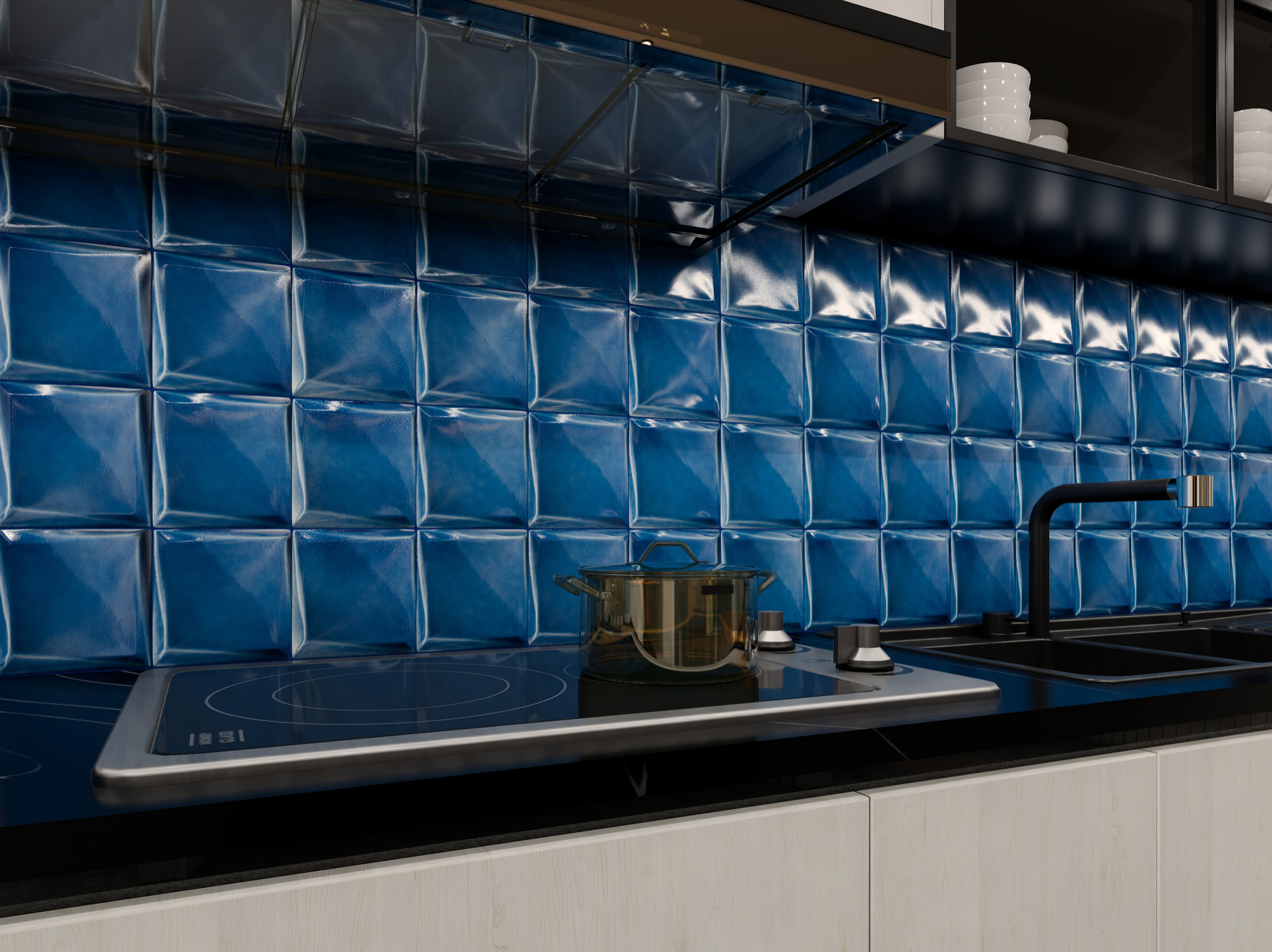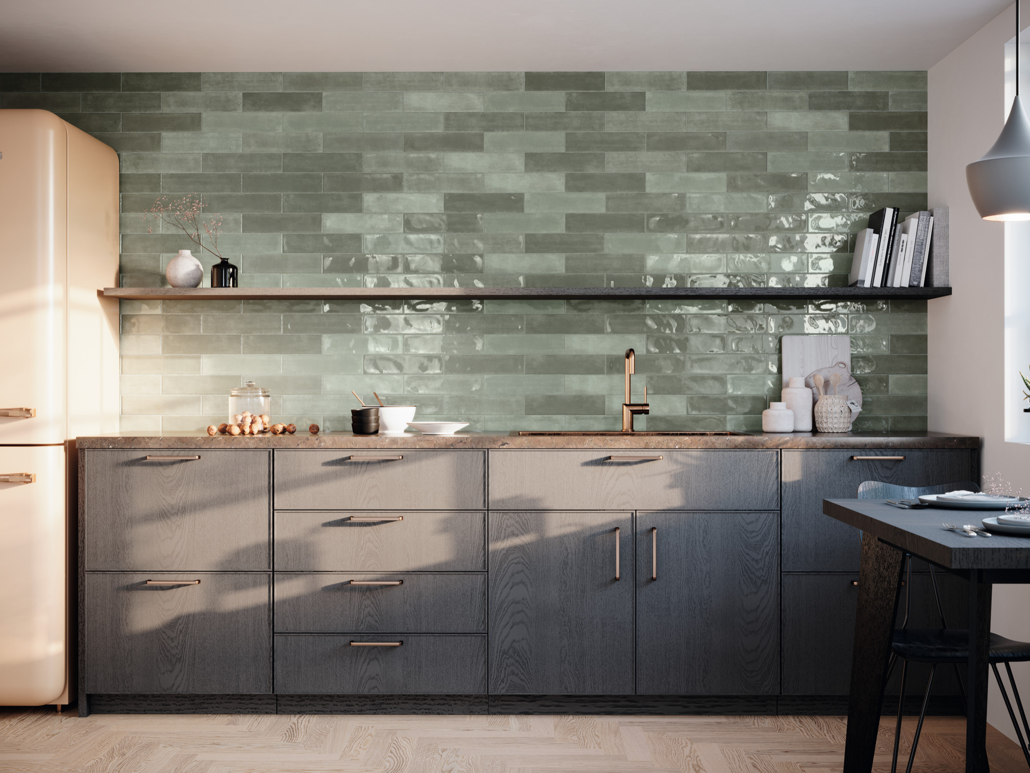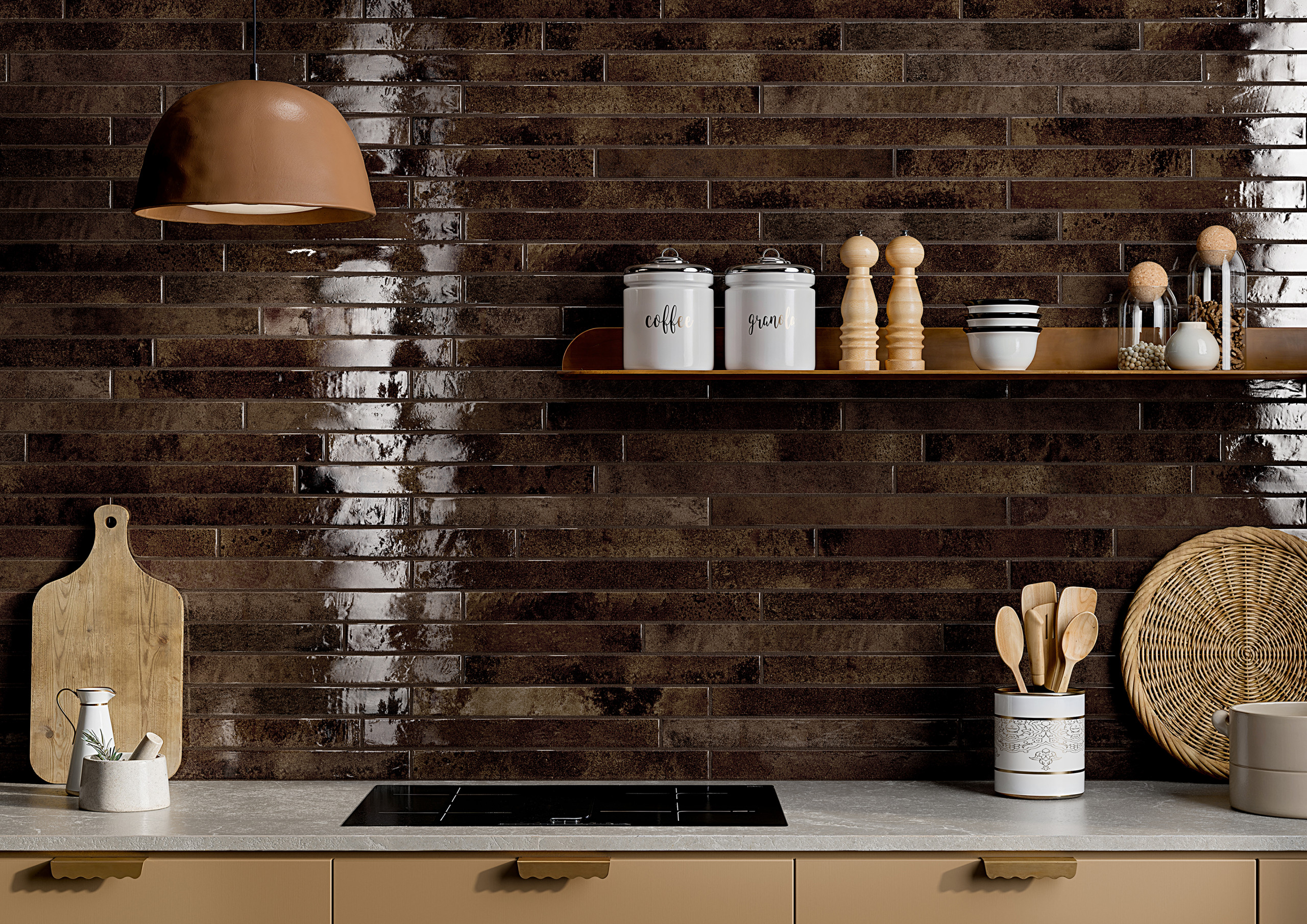 Glossy new Pigmenta glazed ceramic tiles from Emser have a handcrafted look, with color tones varying from tile to tile. Here, 3-by-12-inch tiles in the Dye color glimmer and undulate on a kitchen backsplash. There’s also a 3-by-8-inch size, and the collection includes seven earthy colors.