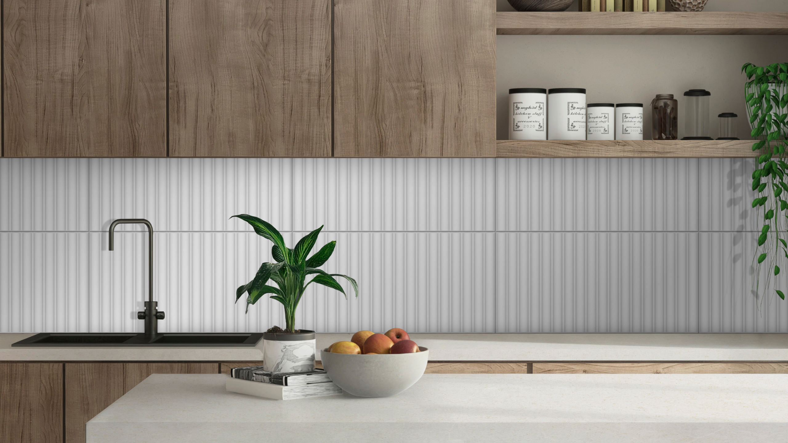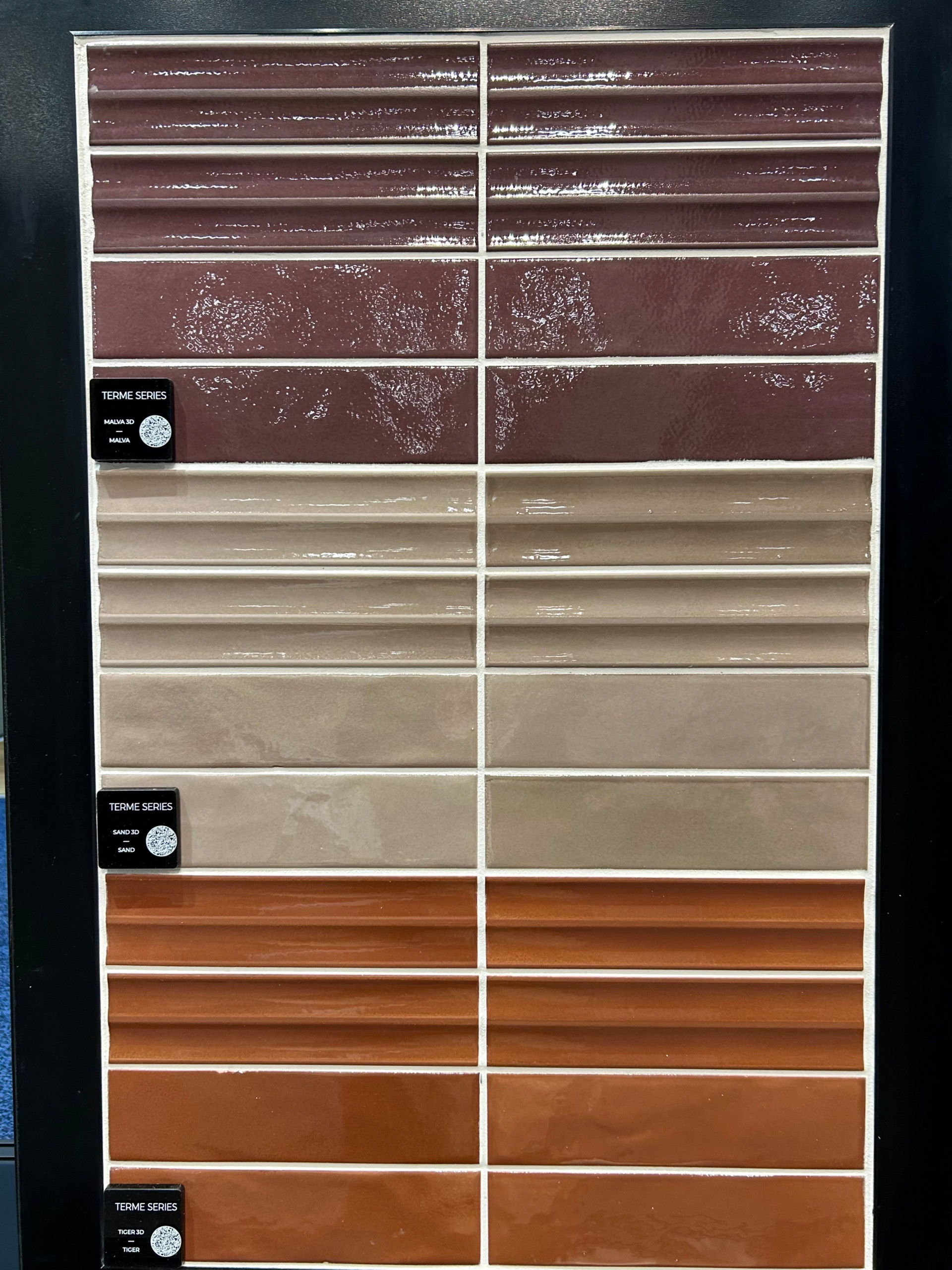 Arizona Tile’s new Terme series has seven nature-inspired colors, including the earthy tones seen here. Other colors include blue, green and several neutrals. The elongated subway tiles come in fluted and flat surfaces that can be mixed for a unique look. The tiles measure 2¼ by 9½ inches. The collection will be available in the spring.