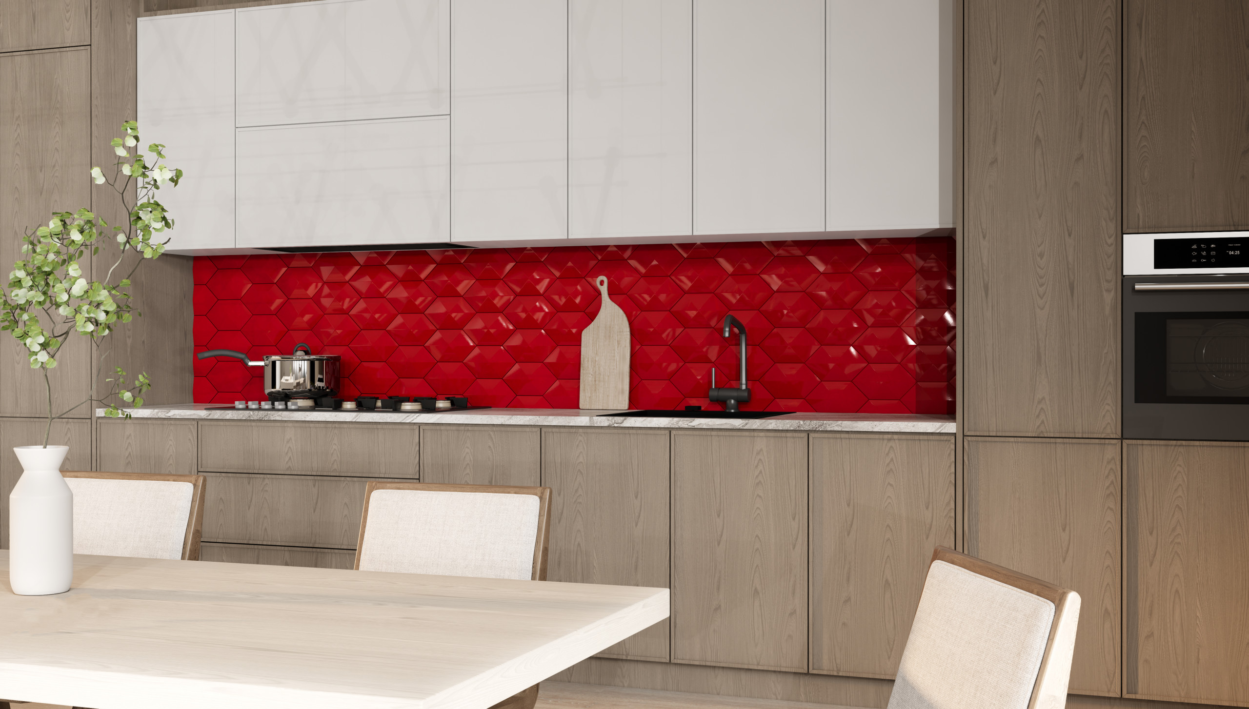 This backsplash celebrates color and dimension with Plurify, a new glazed ceramic tile from E by Emser Tile. There’s a ton of variety in the new collection, including 12 colors, 10 shapes and 13 sizes. The three-dimensional Diamond style in red is shown here.