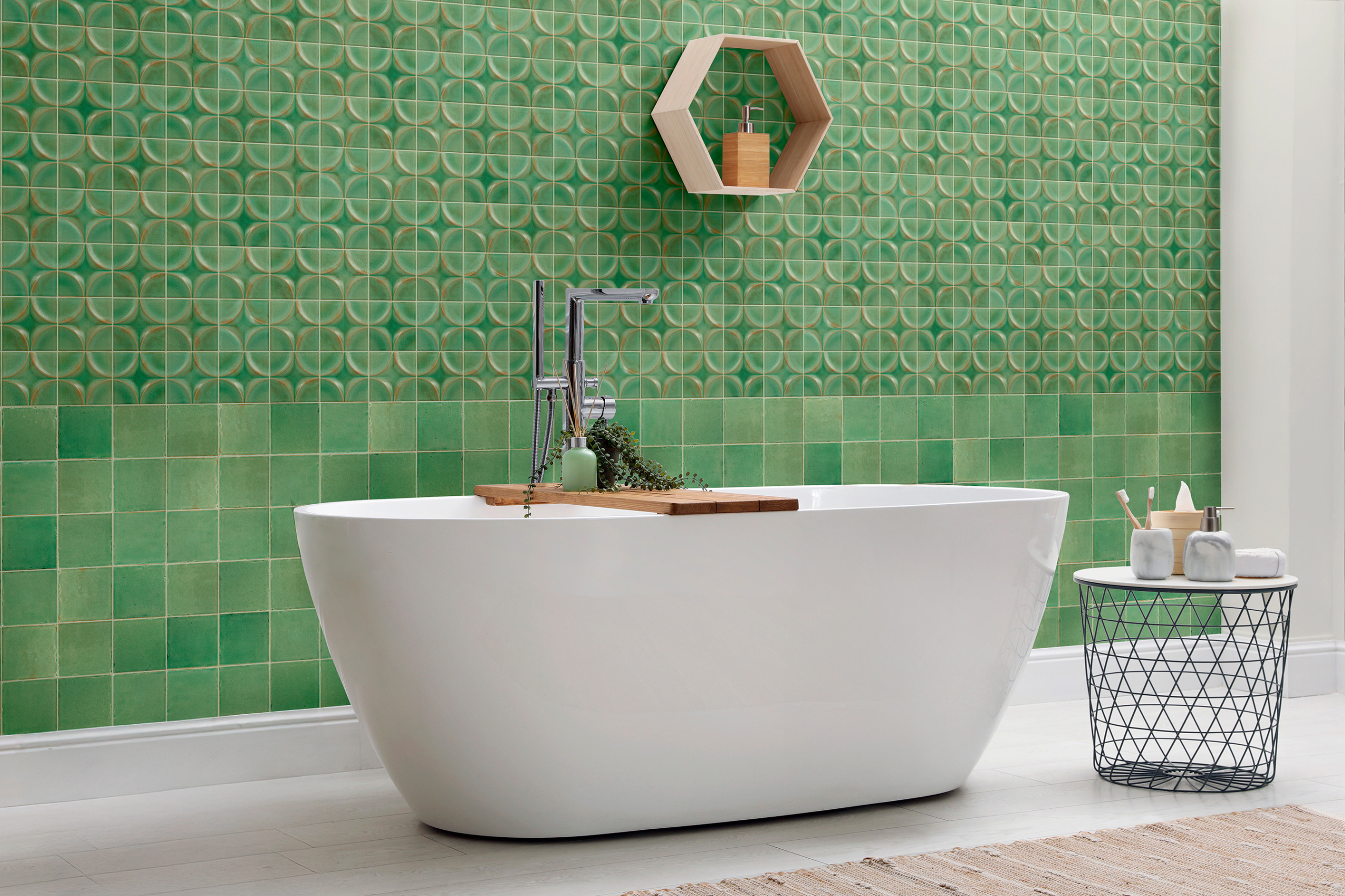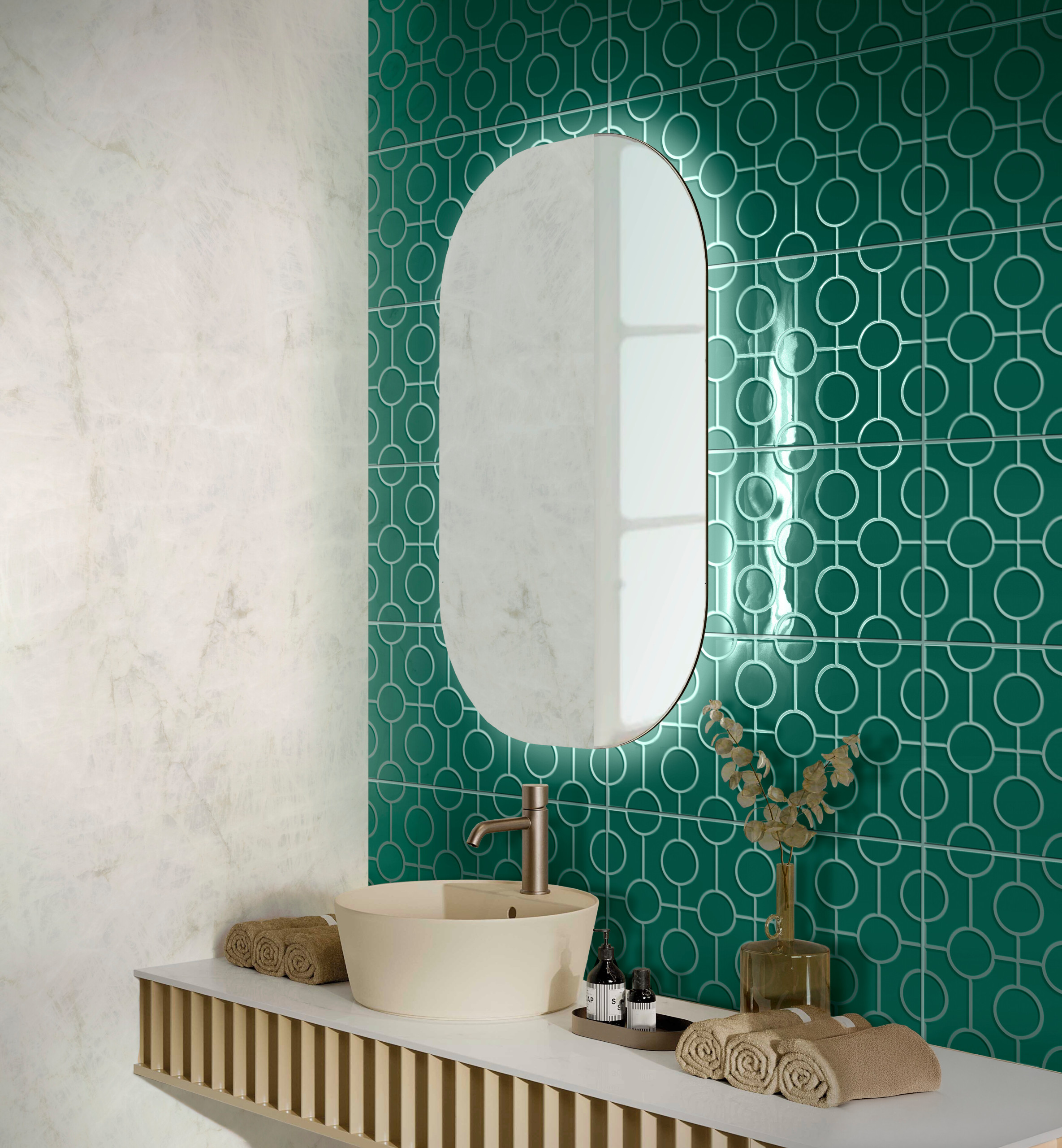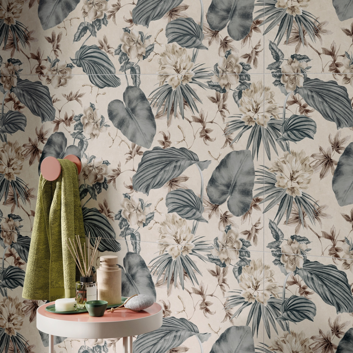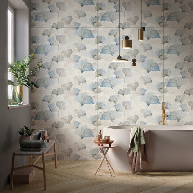 Greens, blues, terra cottas and creamy neutrals inspired by grass, flowers, sky, water and earth remain popular in decorative tile. Floral patterns in muted tones are also still a big part of biophilic design in tile.