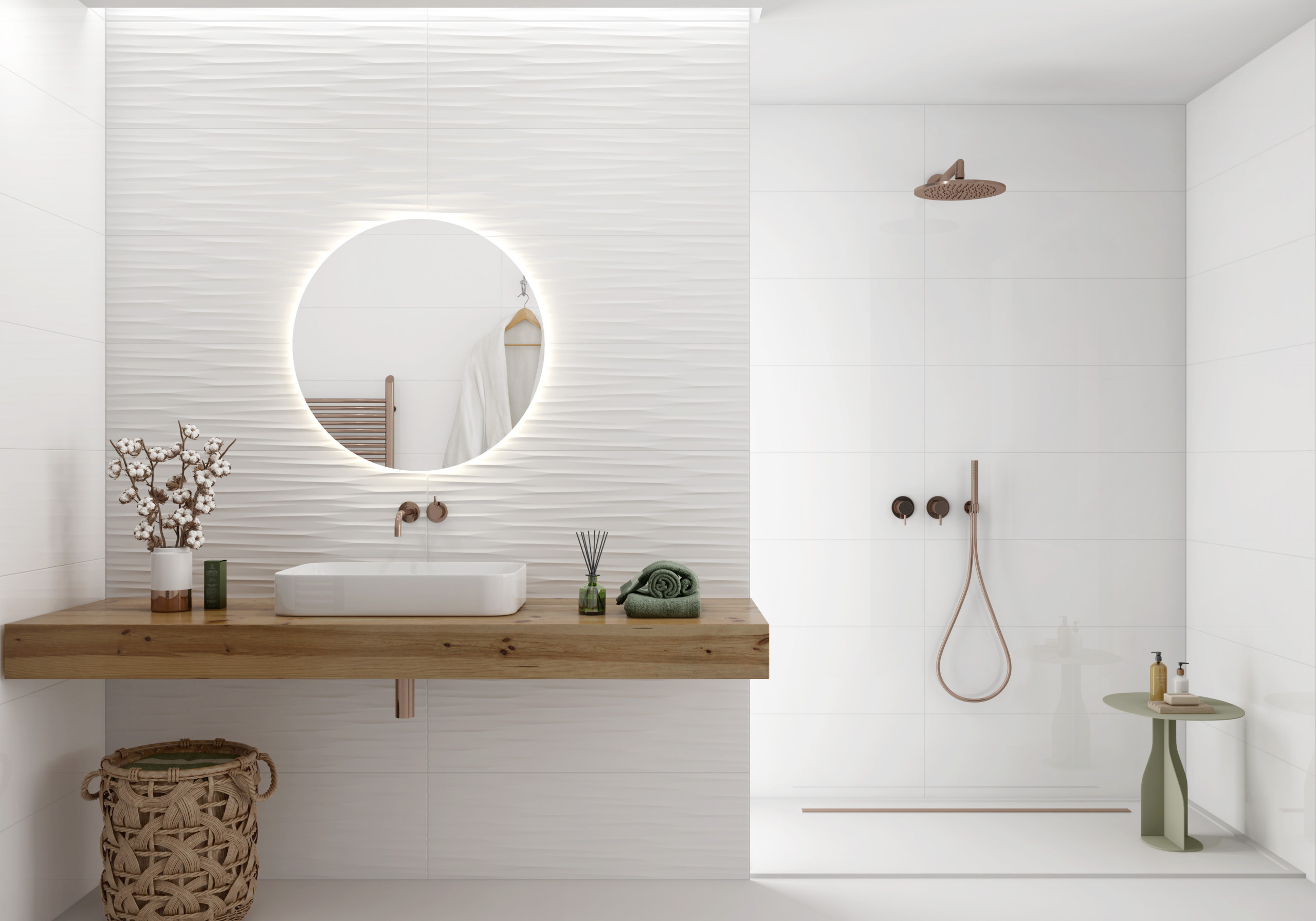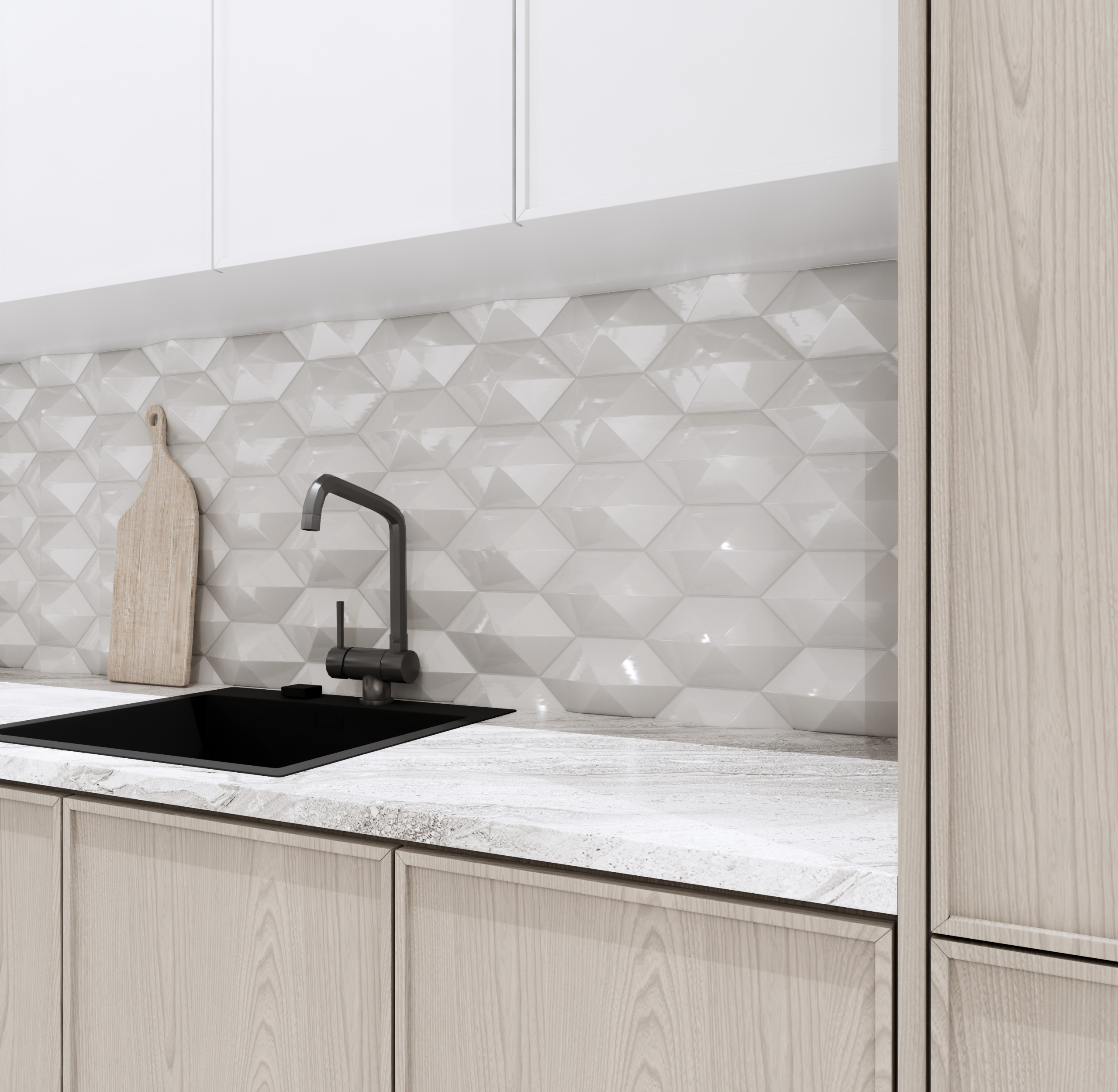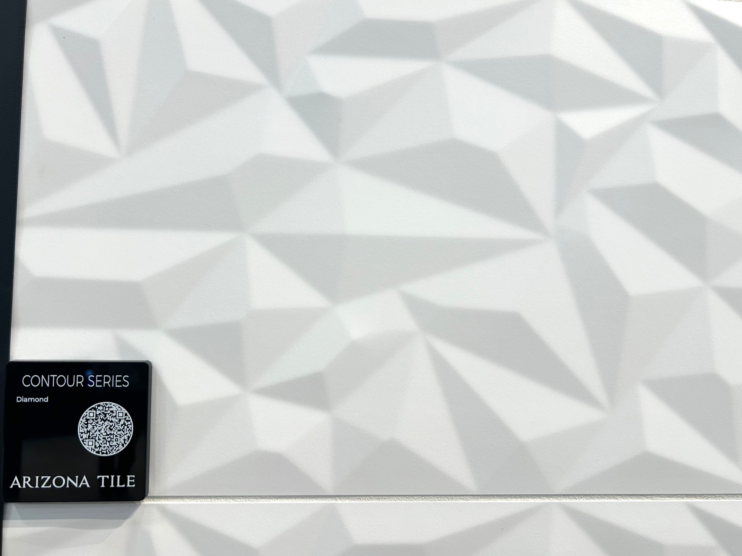 You can give your wall dramatic dimension with Arizona Tile’s light-catching Diamond style from its new Contour series, made in Spain and set to be released later this month. All seven styles in the ceramic collection are white, five with dimensional matte surfaces and two with flat (one glossy, one matte).