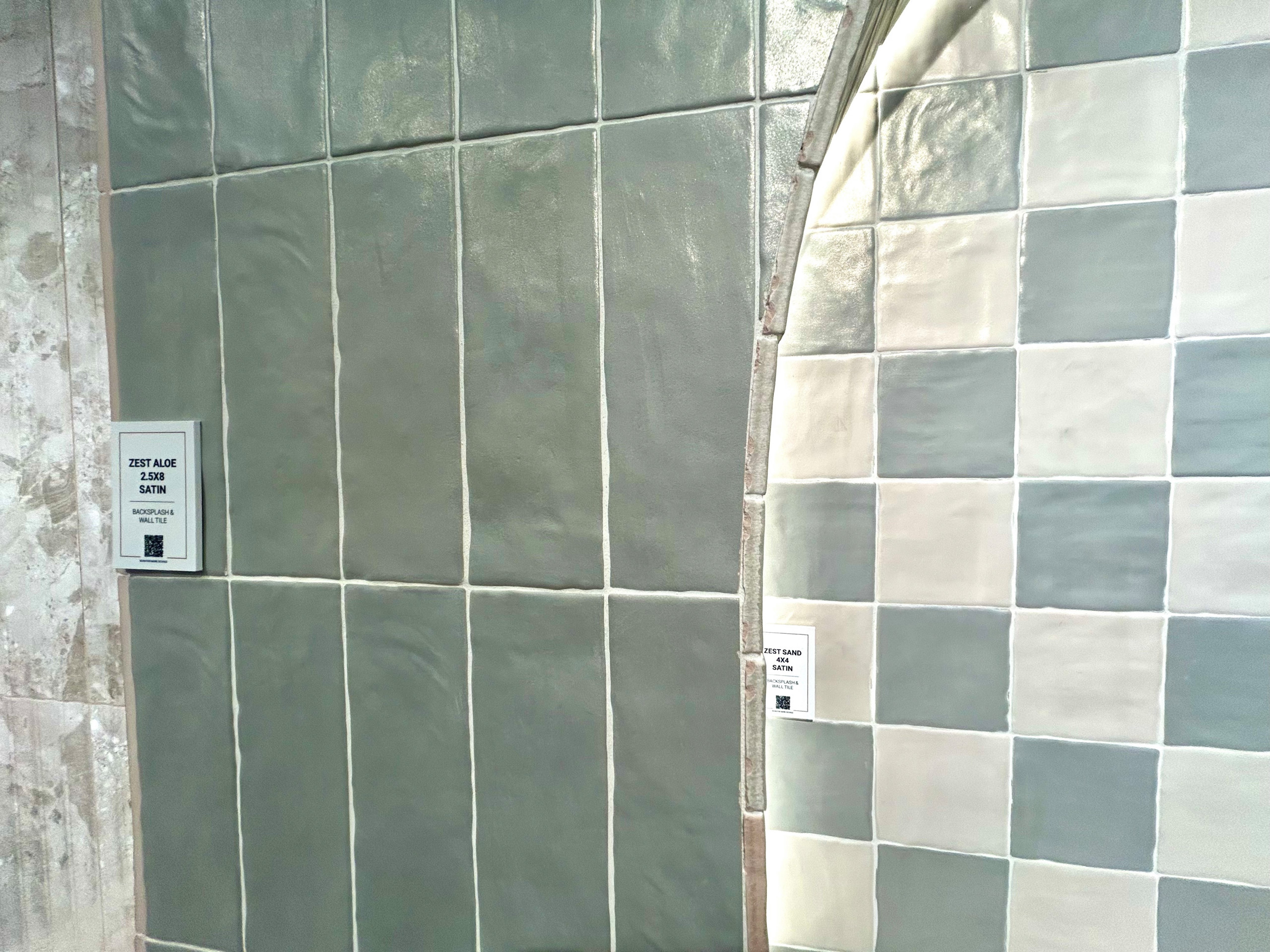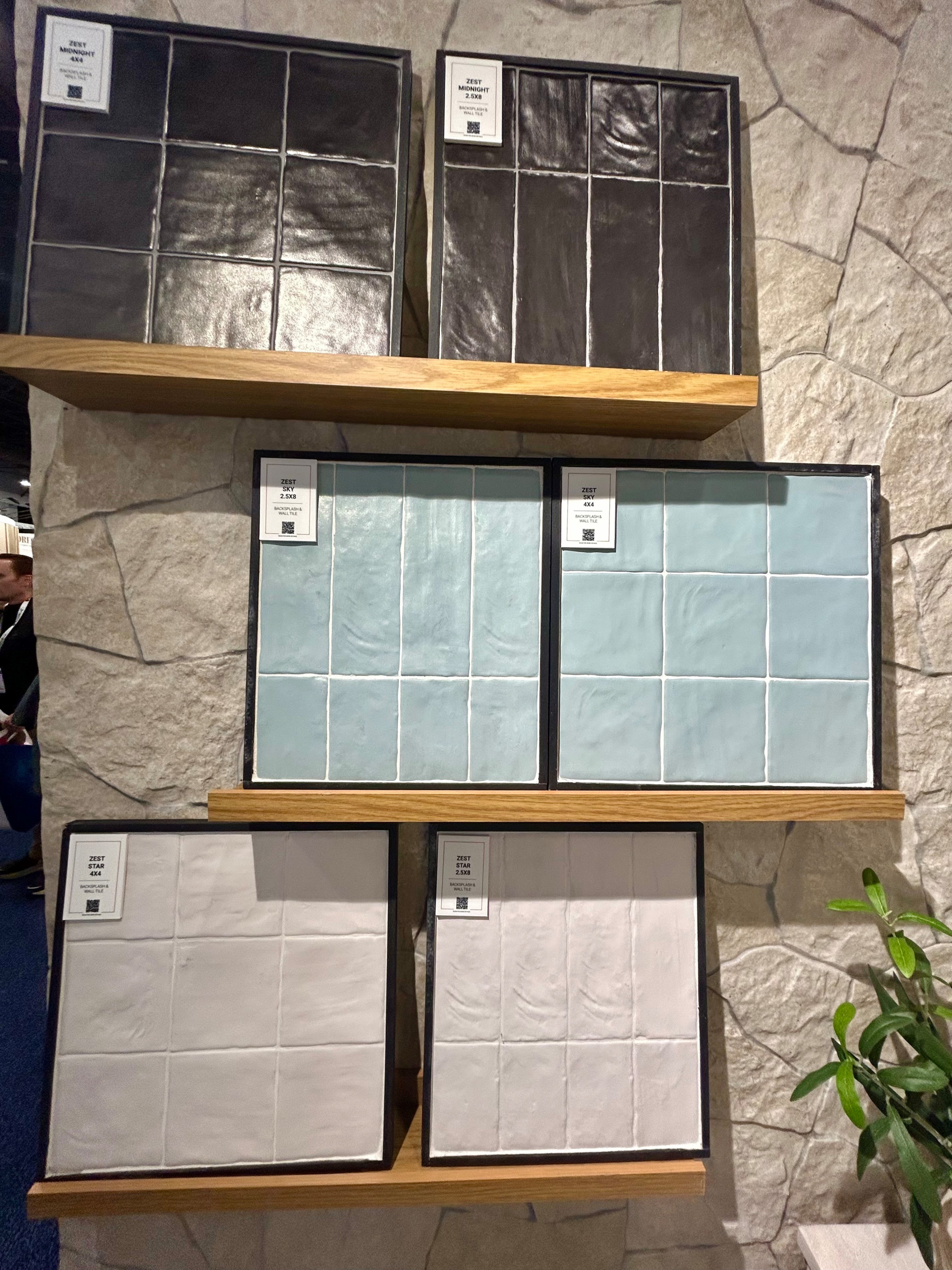 Zest is a new ceramic collection from MSI that has five nature-inspired colors: Sand, Aloe, Star, Sky and Midnight, in 4-inch squares and 2½-by-8-inch rectangles. The tiles have a shiny satin finish inspired by handmade Morrocan zellige tiles. The display seen here shows how the rectangular Aloe tile mixes well with the 4-inch Sand and Aloe.