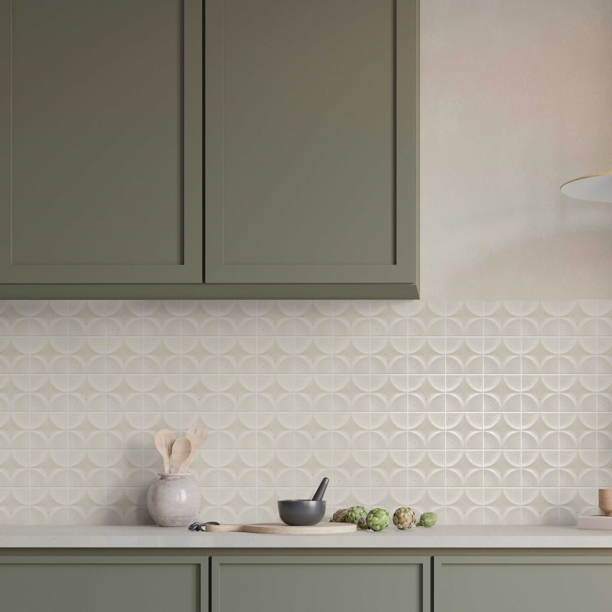And if your feel-good colors are a bit more toned-down, here’s the Feather pattern from Emser’s Plurify collection in the creamy Milk hue.