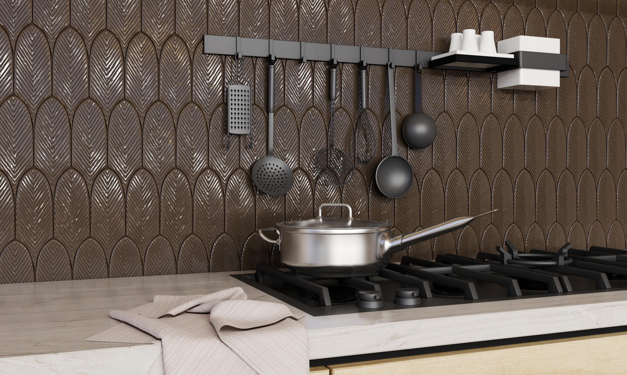 If you’re a chocolate or coffee lover, this backsplash from E by Emser’s Plurify collection should make you happy. The Espresso color in the Feather pattern is like a warm cup of java, and it coordinates well with cream (of course) and other neutral tones.