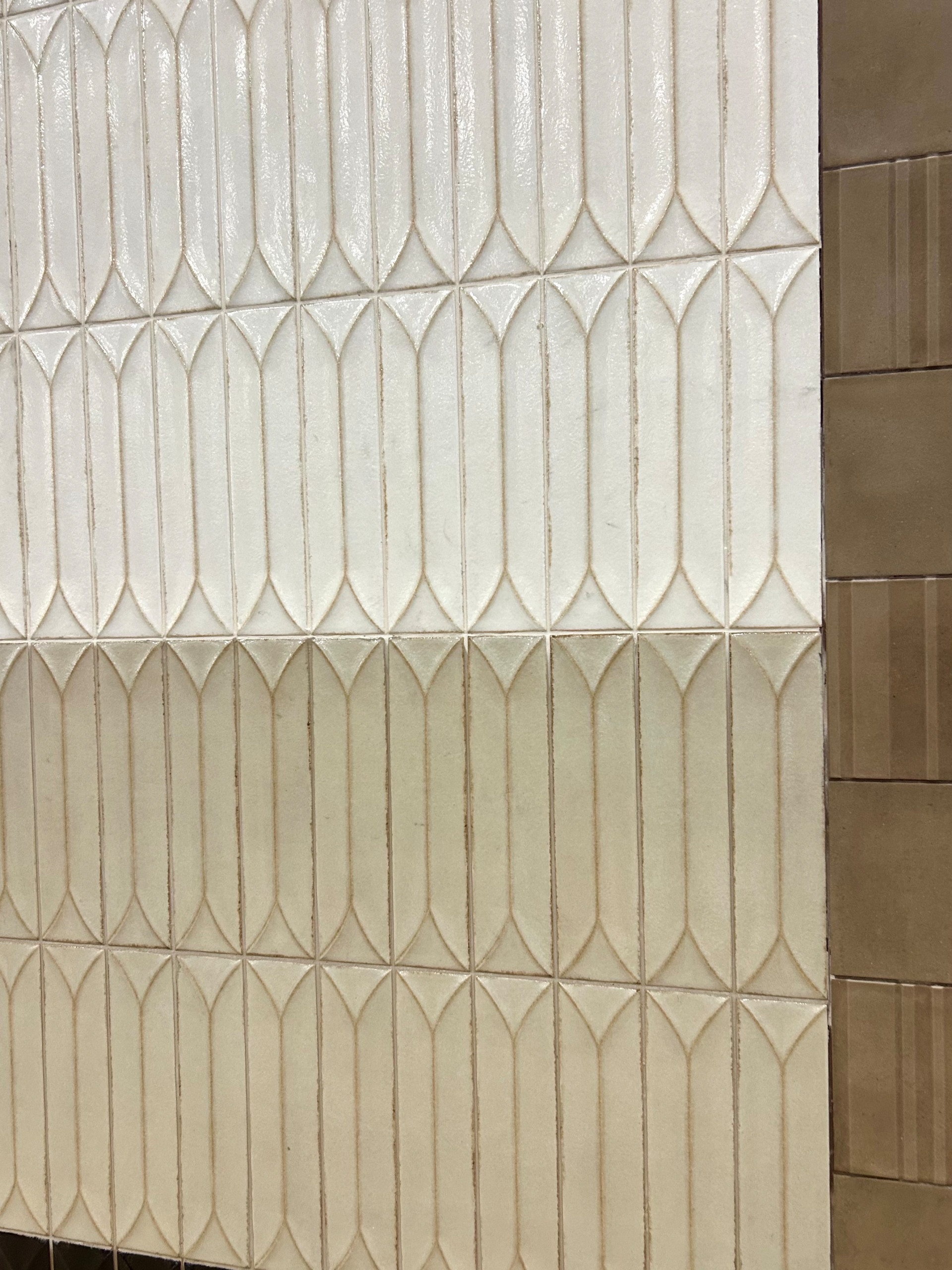 This pretty pattern is called Weave, in Arctic White, from Daltile’s Luminique collection. The tile measures 12 by 24 inches and can be mixed with flat, fluted and other styles from the same collection.