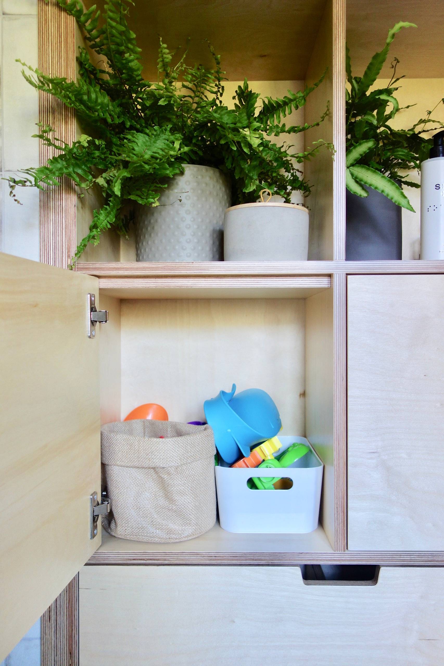 This close-up of a bathroom storage unit Knox designed for a client shows how there’s a compartment for everyone and everything, from bath toys to lotions and potions.