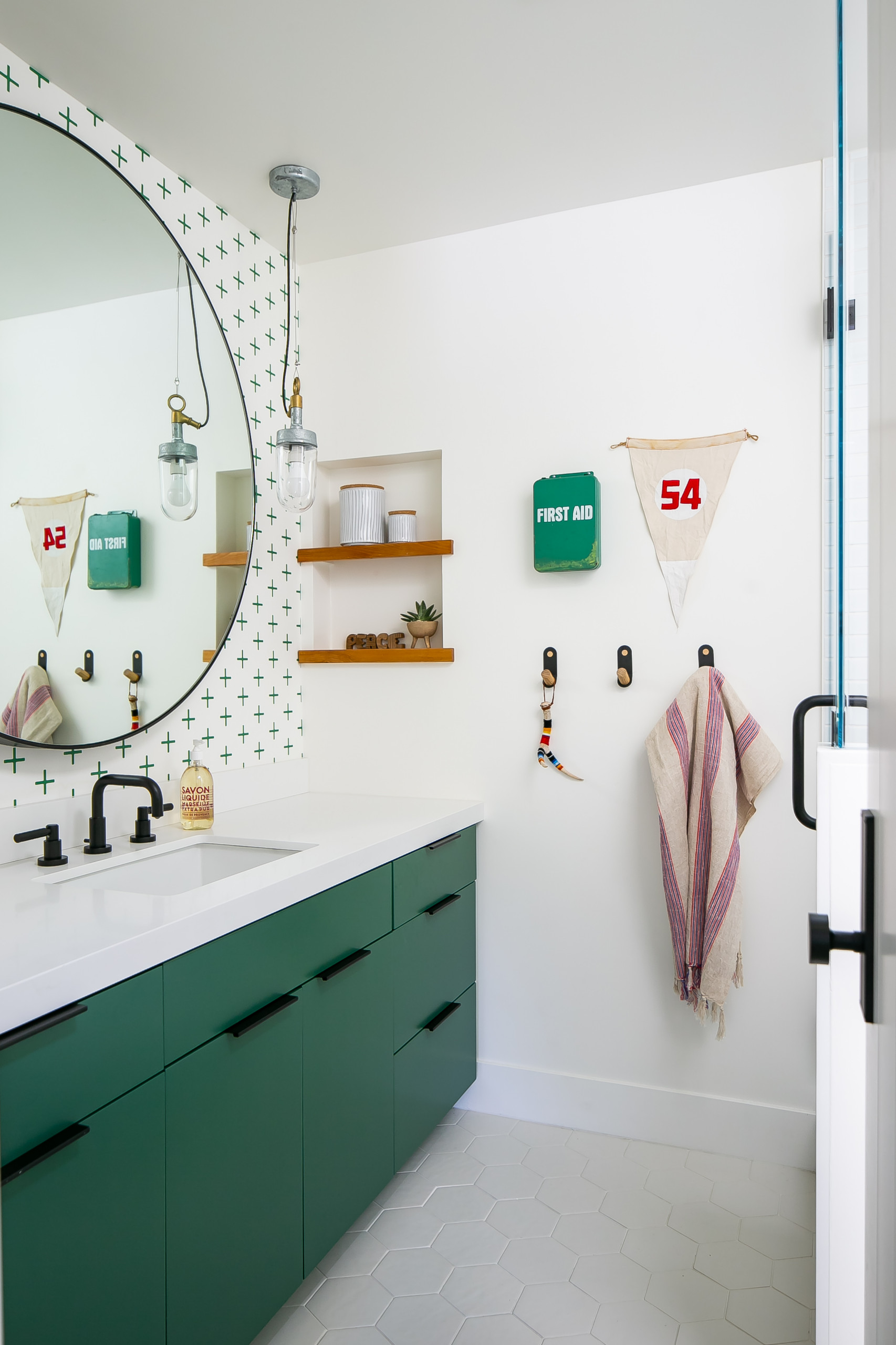 The medicine cabinet doesn’t need to be huge, just big enough for things like beauty products. “Bottles vary in height, of course, so adjustable shelving is a bonus,” she says.