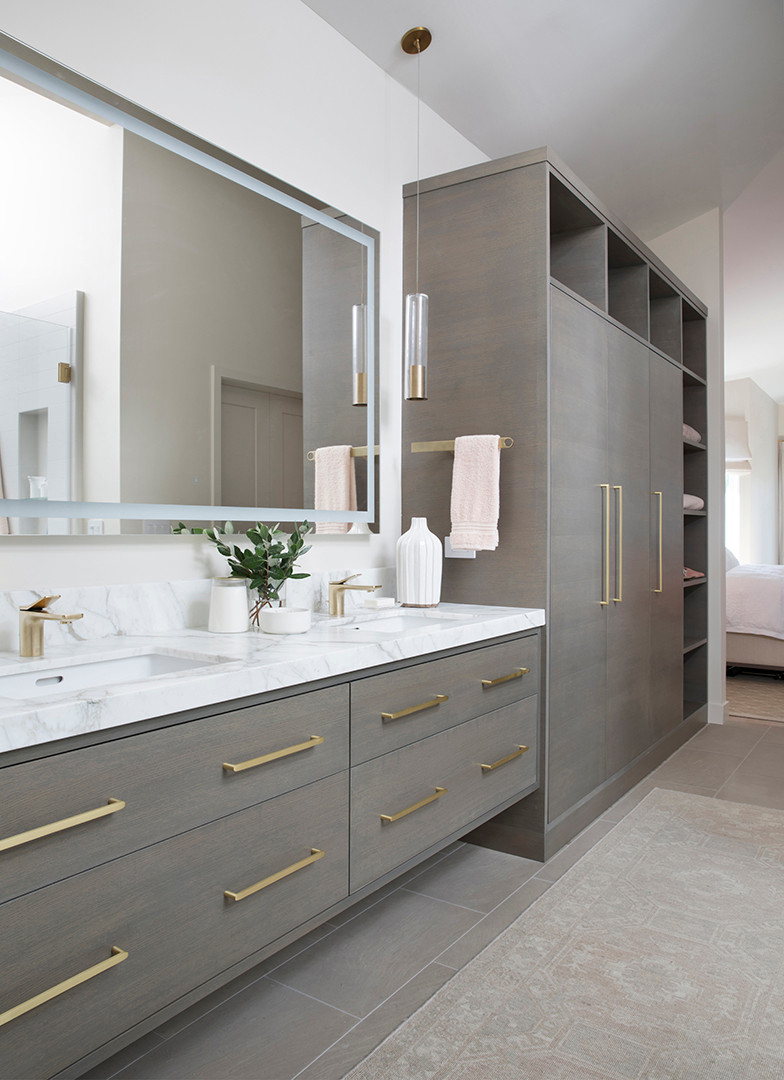 All three professionals agree that closed storage is preferable. “Toiletries involve spills and mess, so open shelving is best kept to a minimum and used only for decorative touches, such as plants or candles,” Byrne says.