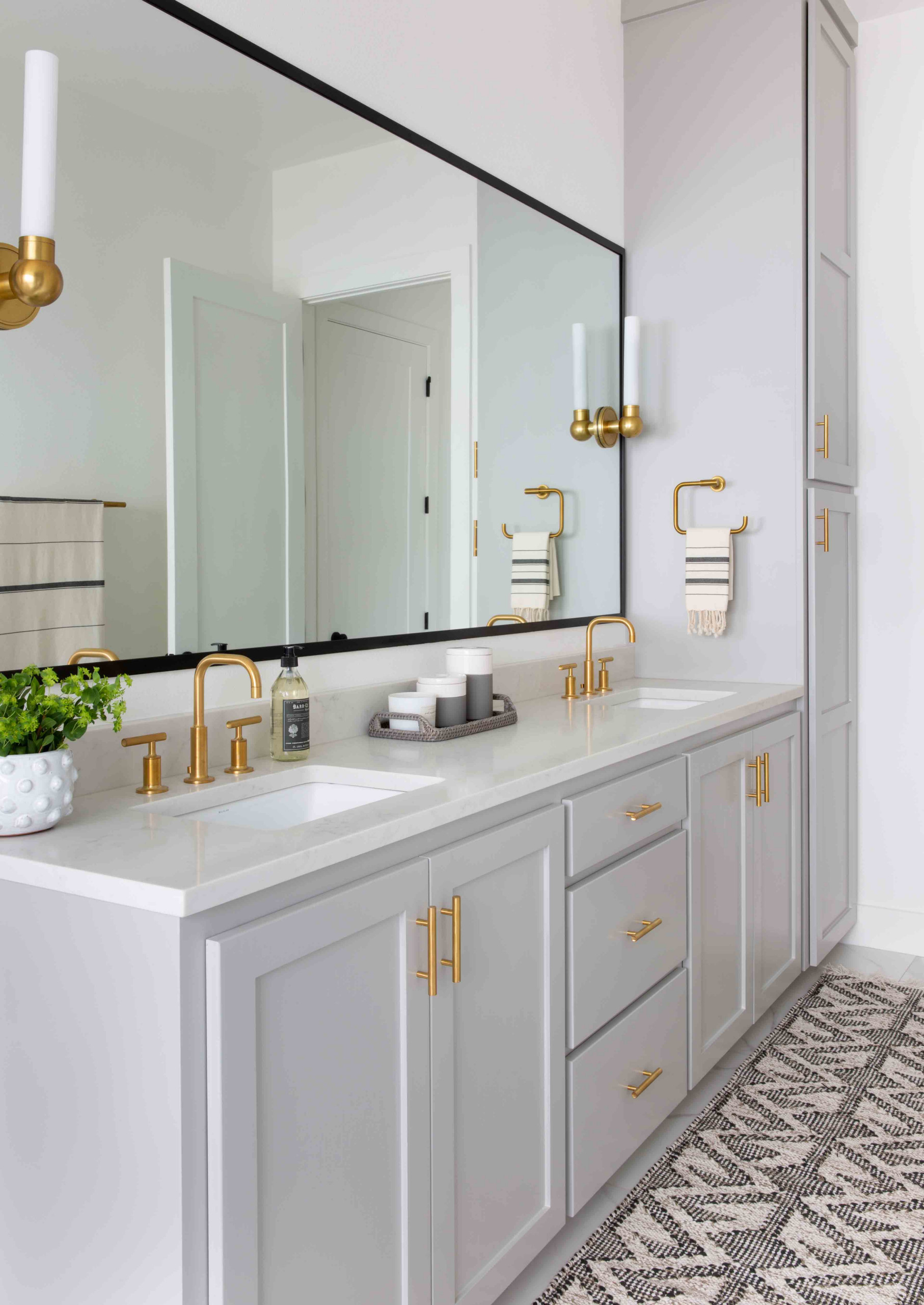 “Drawer dividers are essential and great for organizing makeup or shaving gear,” Rezende says. She adds, however, that if your bathroom is especially small, undersink storage might be something to avoid altogether. “It can make the bathroom look smaller and busier,” she says.