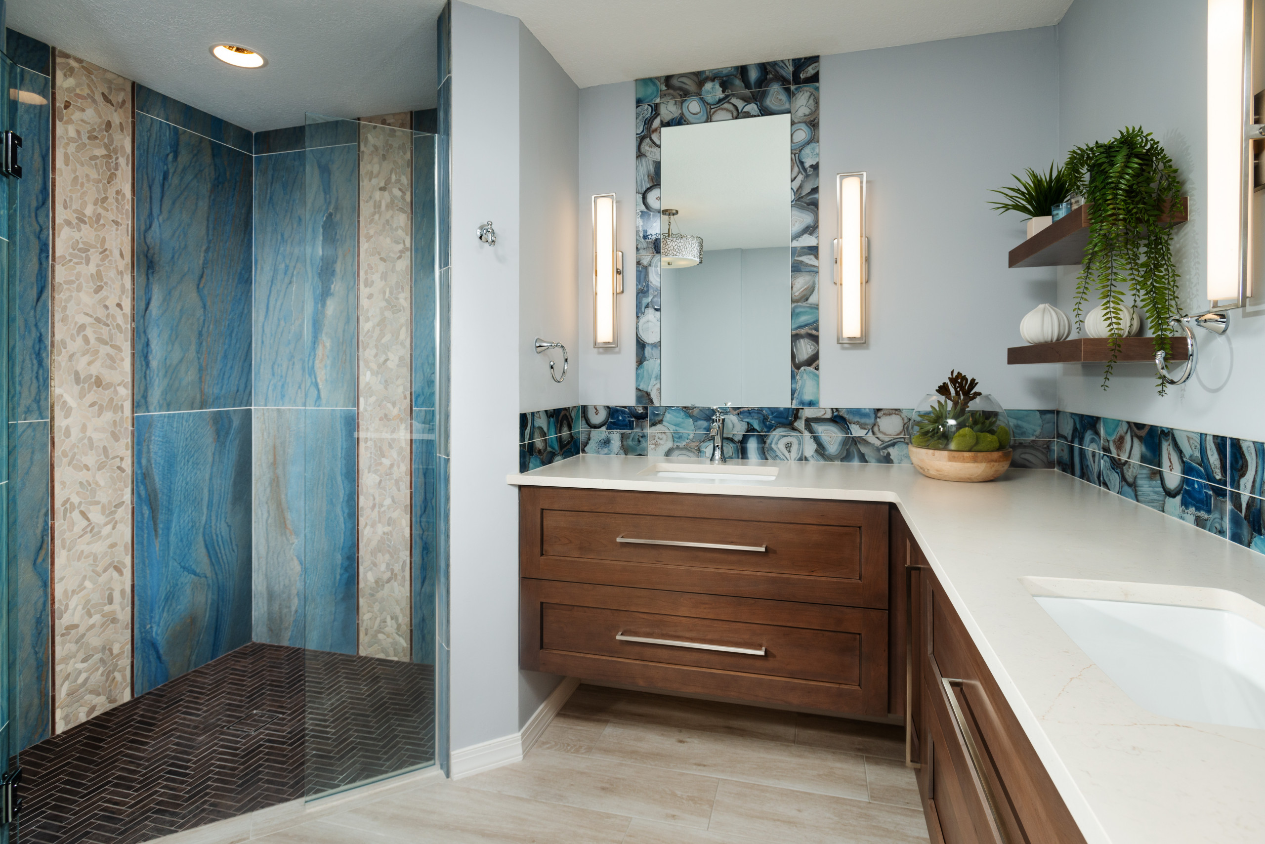 “Shelves or alcoves can make a real statement,” Rezende says, “but unless they’re in a shower or bathtub area, they can be tricky to keep clean.”