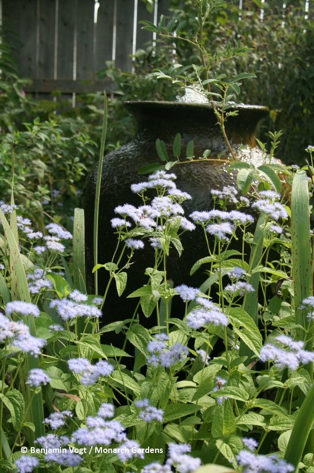 Blue Mistflower (Conoclinium coelestinum). Native from the central U.S. to the East Coast. This relative of Joe Pye Weed blooms in late summer into fall, reaching 2 to 4 feet tall. Thriving in sun to partisl shade in medium soil (it’s really quite adaptable, though moist might be best in full sun), this short plant will run and spread moderately fast. Diverse insects feed on the nectar, so it’s great for a butterfly garden.