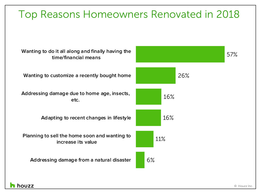 The top trigger for home renovations in 2018 was “wanting to do it all along” and finally having either the time or the financial means (or both). The second-most-popular reason homeowners cited for renovating was wanting to customize a recently purchased home.