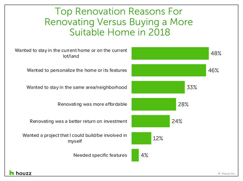 The No. 1 reason homeowners on Houzz chose to renovate in 2018 rather than buy a more suitable home was wanting to stay in their current home or on their current property (48 percent). A close second was wanting to personalize the home or its features (46 percent). One-third said they wanted to stay in their neighborhood.