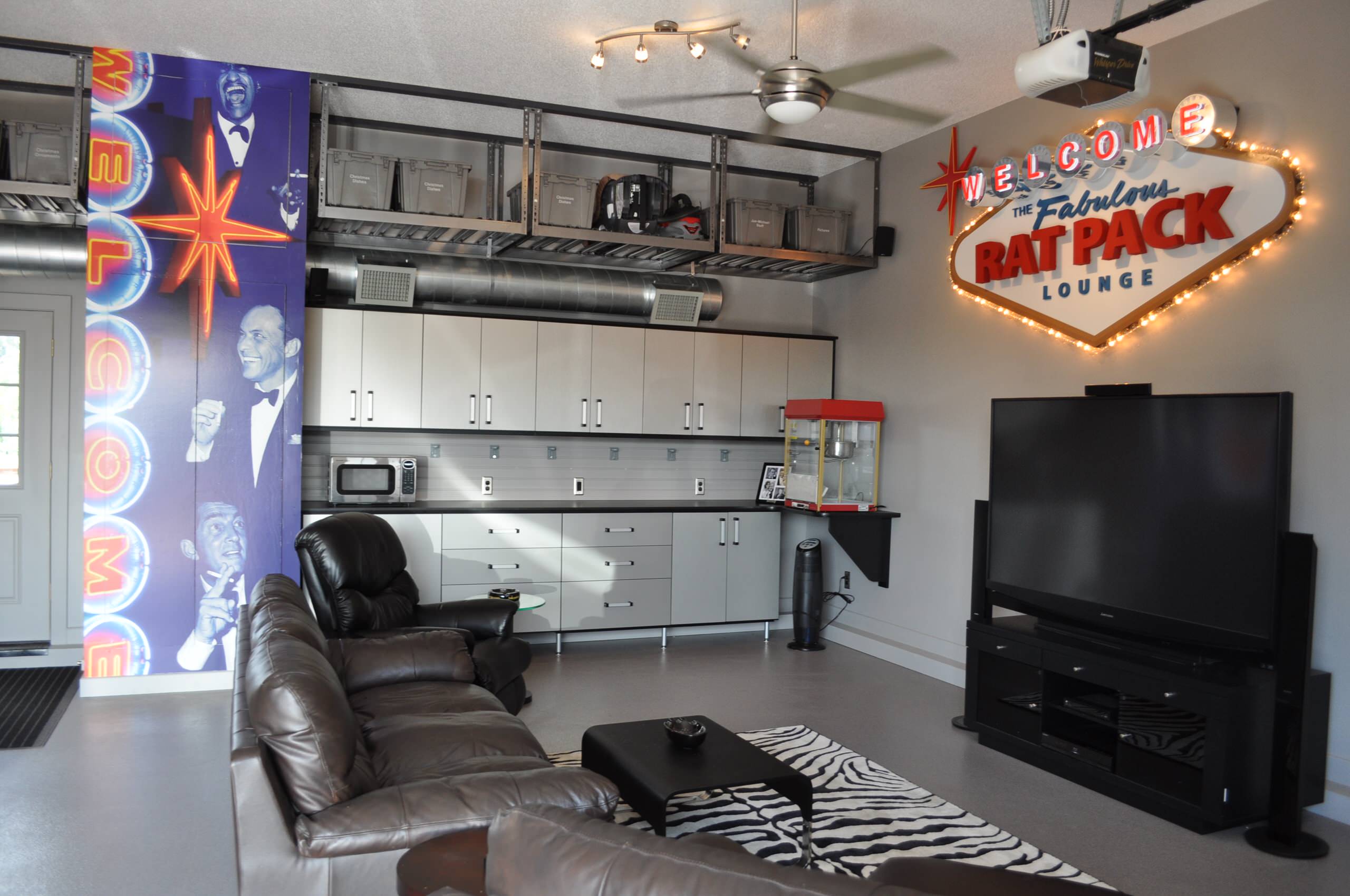 This homeowner, meanwhile, wanted to use his garage as an entertainment hub where he could watch TV, serve beer, smoke cigars and easily access the backyard pool and barbecue, but still be able to store things like bikes, strollers and toys. To make all this happen, designer Kate Cullen at California Closets Twin Cities created a kitchen area for a kegerator and overhead storage for his kids’ bikes and toys.