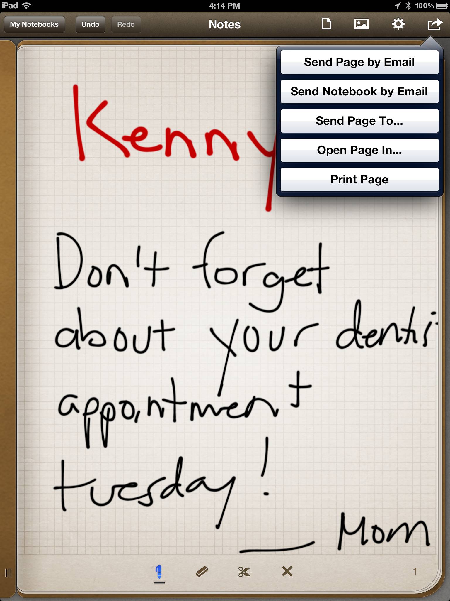 Notes and notifications are easily shared. The iPad supports pen input, and styli of every description are available. (Plus, a finger works fine too.) Best of all, apps like Penultimate will let you write notes to family members and email them at the same time.