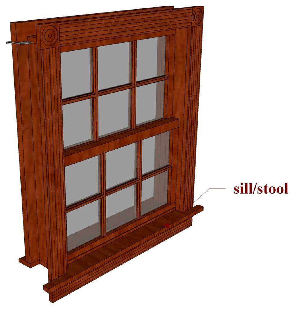 Also called a stool, the windowsill is the bottom portion of a window frame adjacent to the bottom rail of the bottom sash. The sill is also the platform at the bottom of the window assembly that extends outward from the window. On the exterior, it is angled downward and sometimes has a groove underneath to channel away water, much like a drip cap.