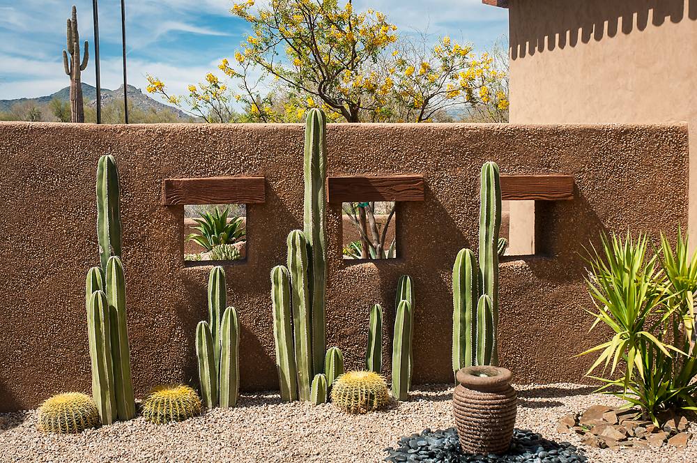 2. Add textural contrast with spiky yucca. Create a stunning contrast of opposing textures by adding a spiky yucca alongside a cluster of golden barrel cactuses. This arrangement can be used to create dramatic interest in any bare corner in the landscape or next to a sunny entry.
