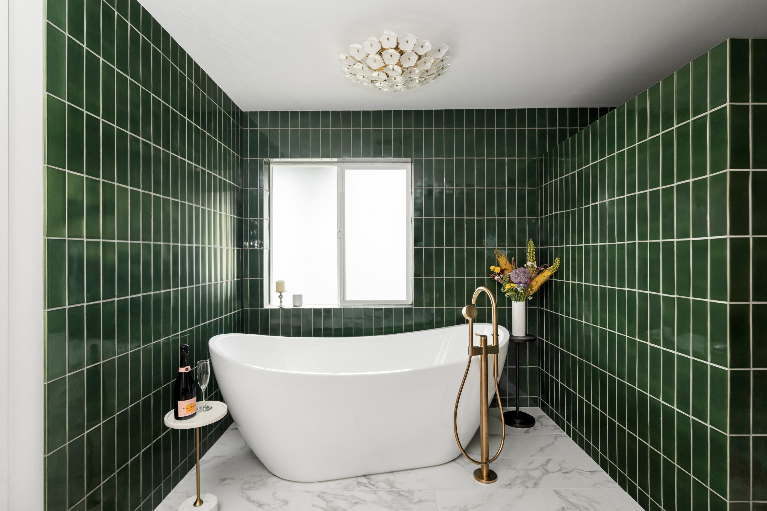 Overhead, the white-glass-and-brass ceiling light is damp-rated and adds an intricate flower pattern to the modern material palette. It’s also a hint that a big floral surprise awaits elsewhere in the bathroom.