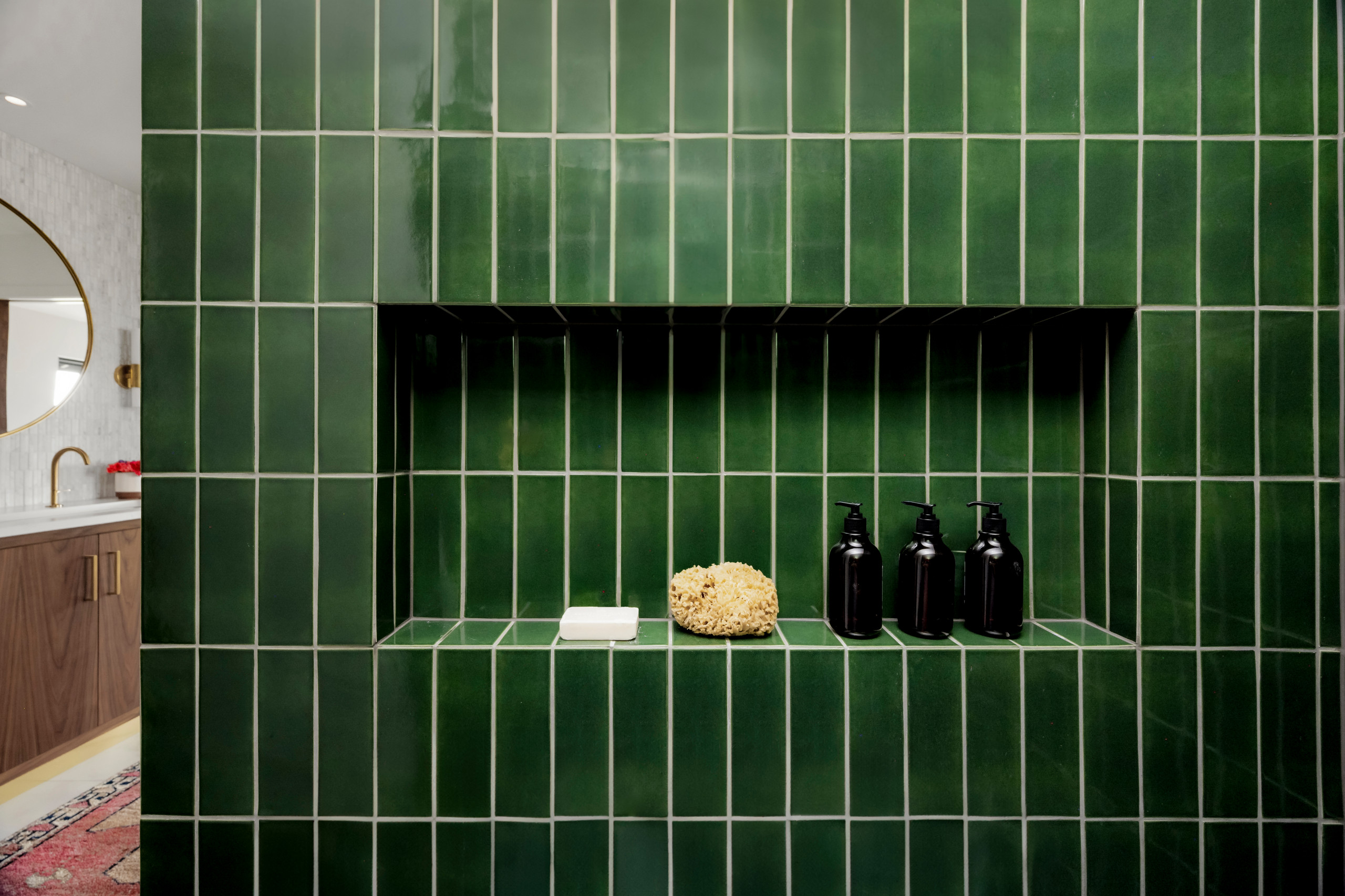 The marble-tile-clad platform continues into the shower, where the floor shifts to 2-by-2-inch tiles. The increased grout lines provide extra traction. The rich green wall tile extends into the shower as well. Notice how the top row of tiles on the partial wall (left) remains full-size and aligns perfectly with the tiles and grout lines on the adjacent wall — a result of meticulous planning and installation.