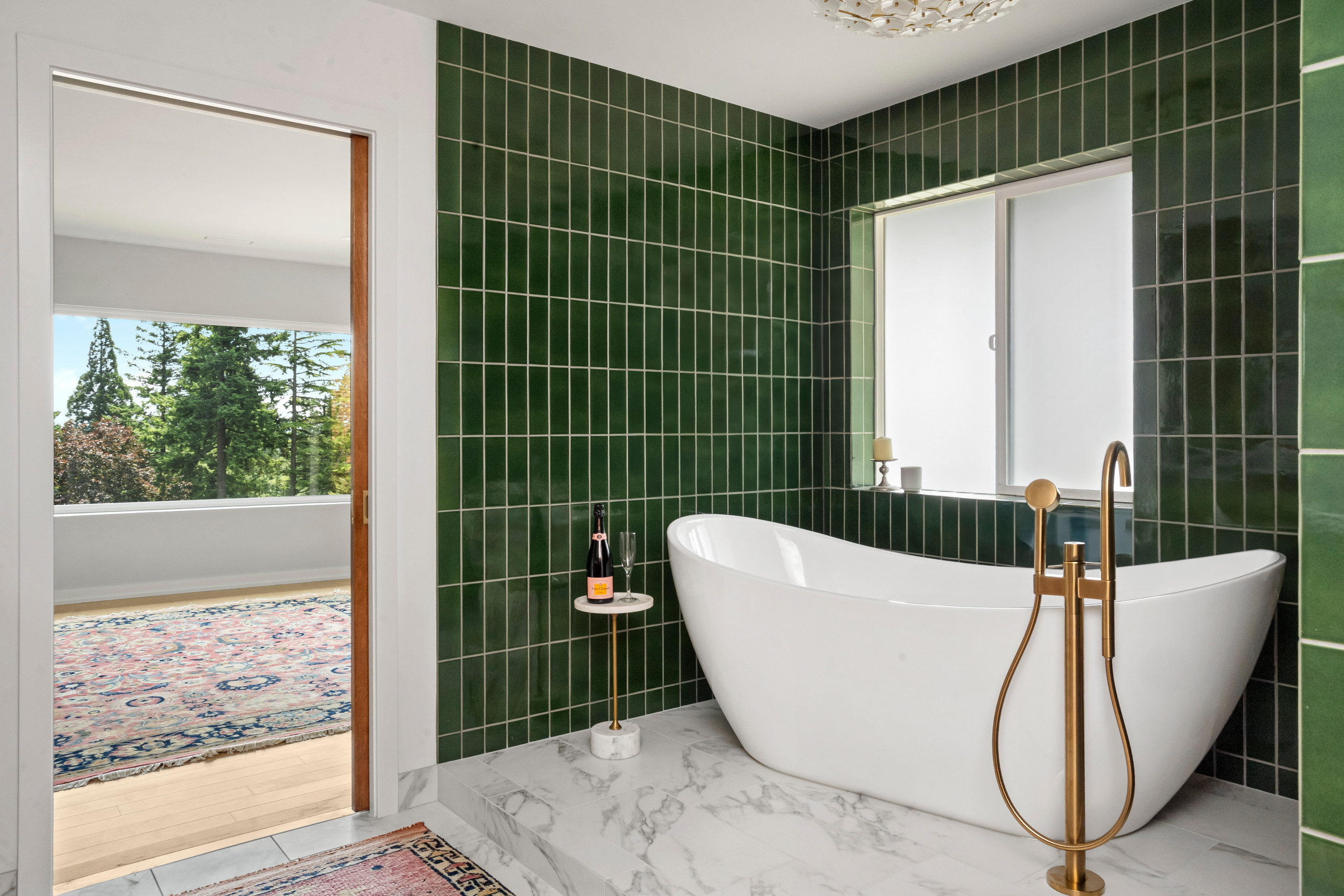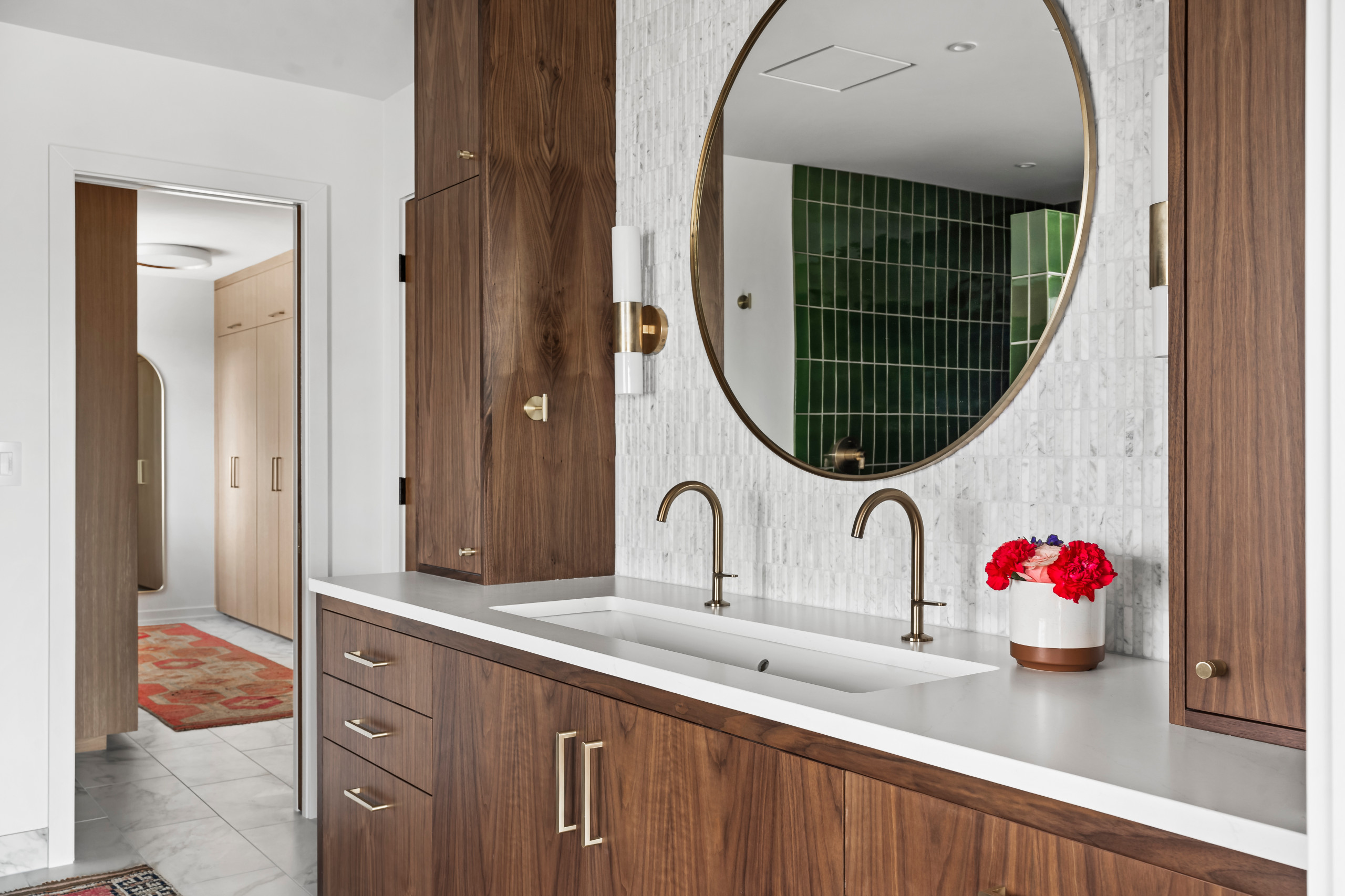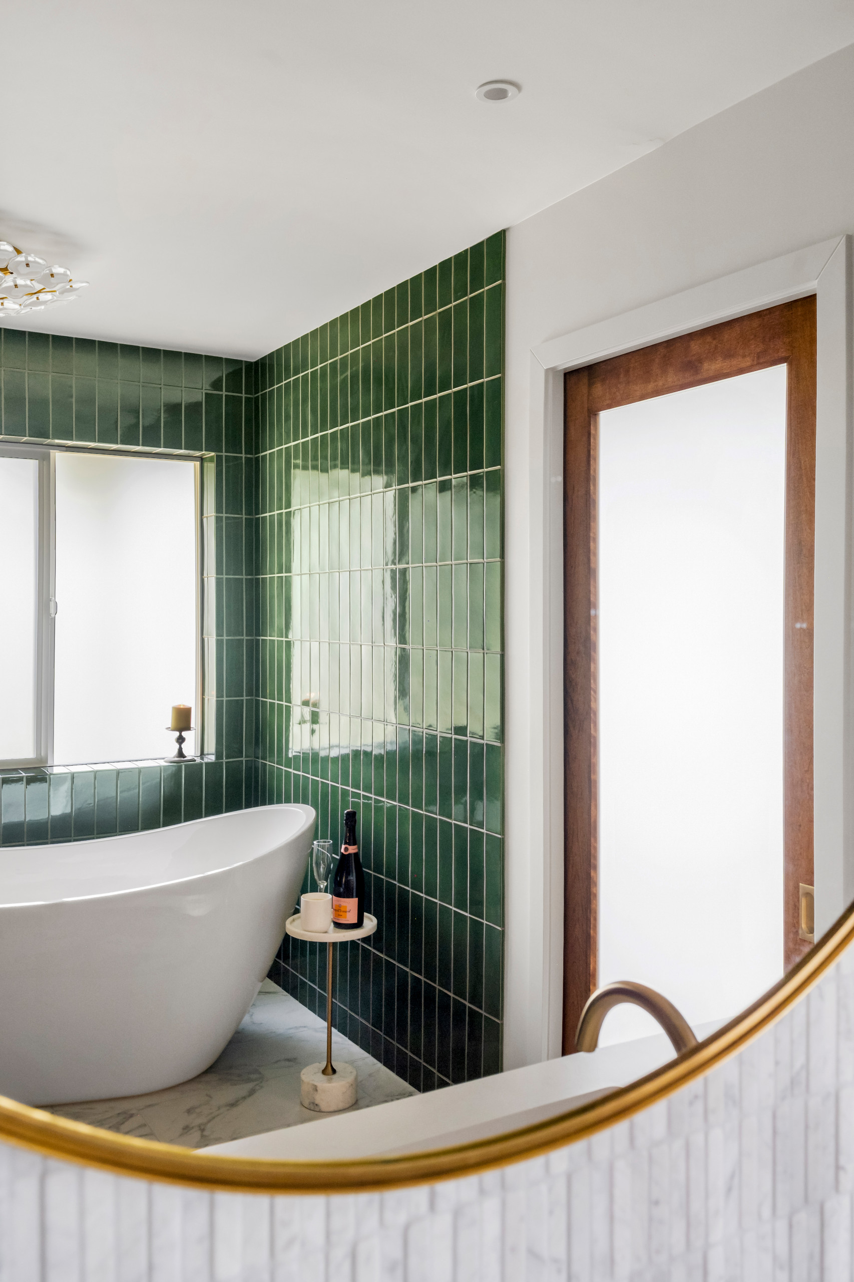 After: The wife suggested introducing a bold green tile, which became the jumping-off point for the entire design. “It was just a matter of finding one in the right color and shape,” Fraley says. “Everything else fell into place from there.” That “everything else” includes a walnut double vanity with a marble mosaic tile backsplash, marble floors, a sculptural tub and refined brass accents.
