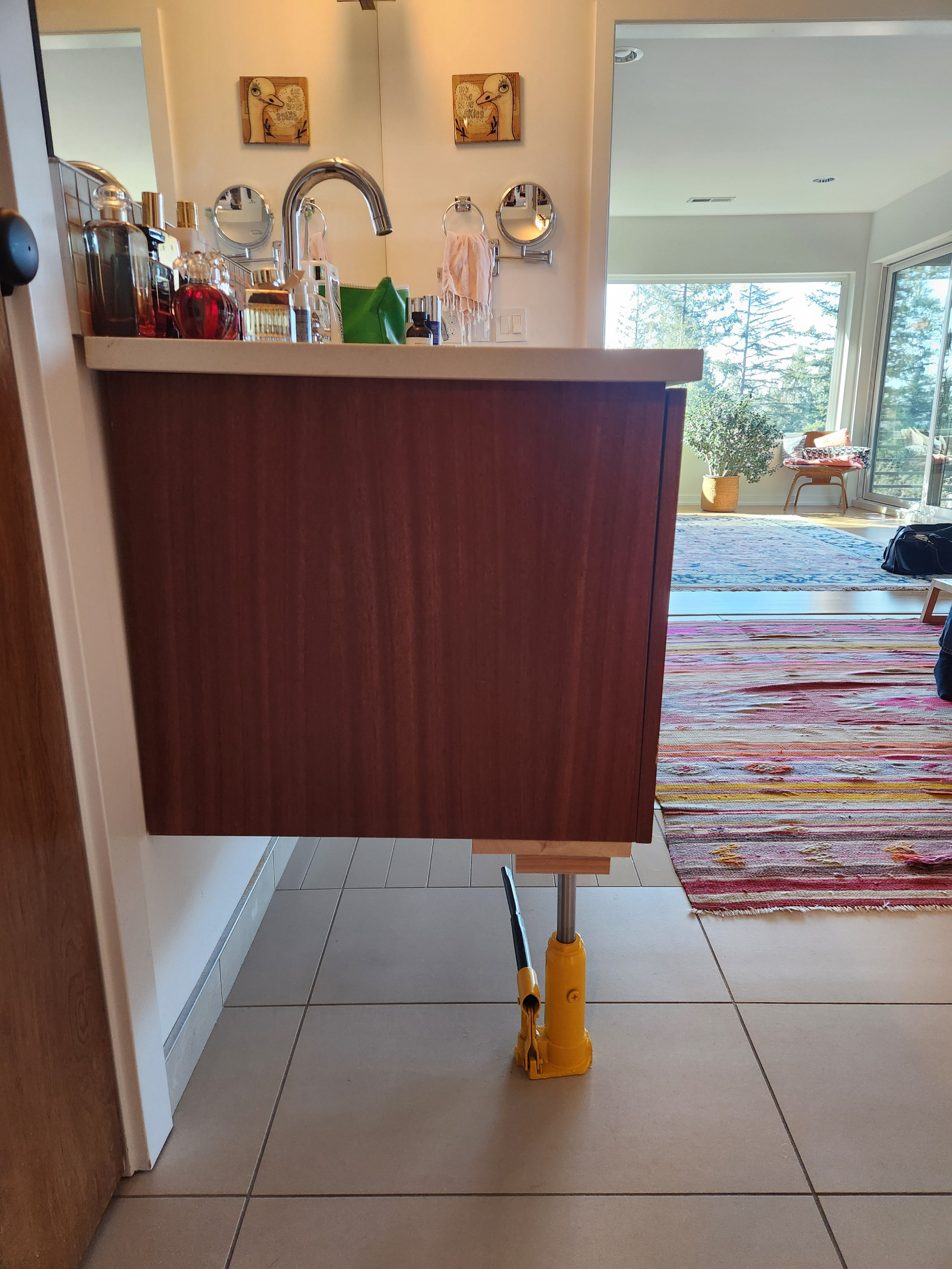 Before: One thing the bathroom had going for it was a generous 150-square-foot footprint, which wasn’t changed during the renovation. However, the room was in terrible shape. “This had been a flip job in the early 2000s and it was very beige,” Fraley says. “It had a big tile tub surround that wasted a lot of space, and the floor of the shower had a lot of mildew and grout issues.” As the wall-mounted vanity began to fail, the homeowners resorted to propping it up with a car jack.