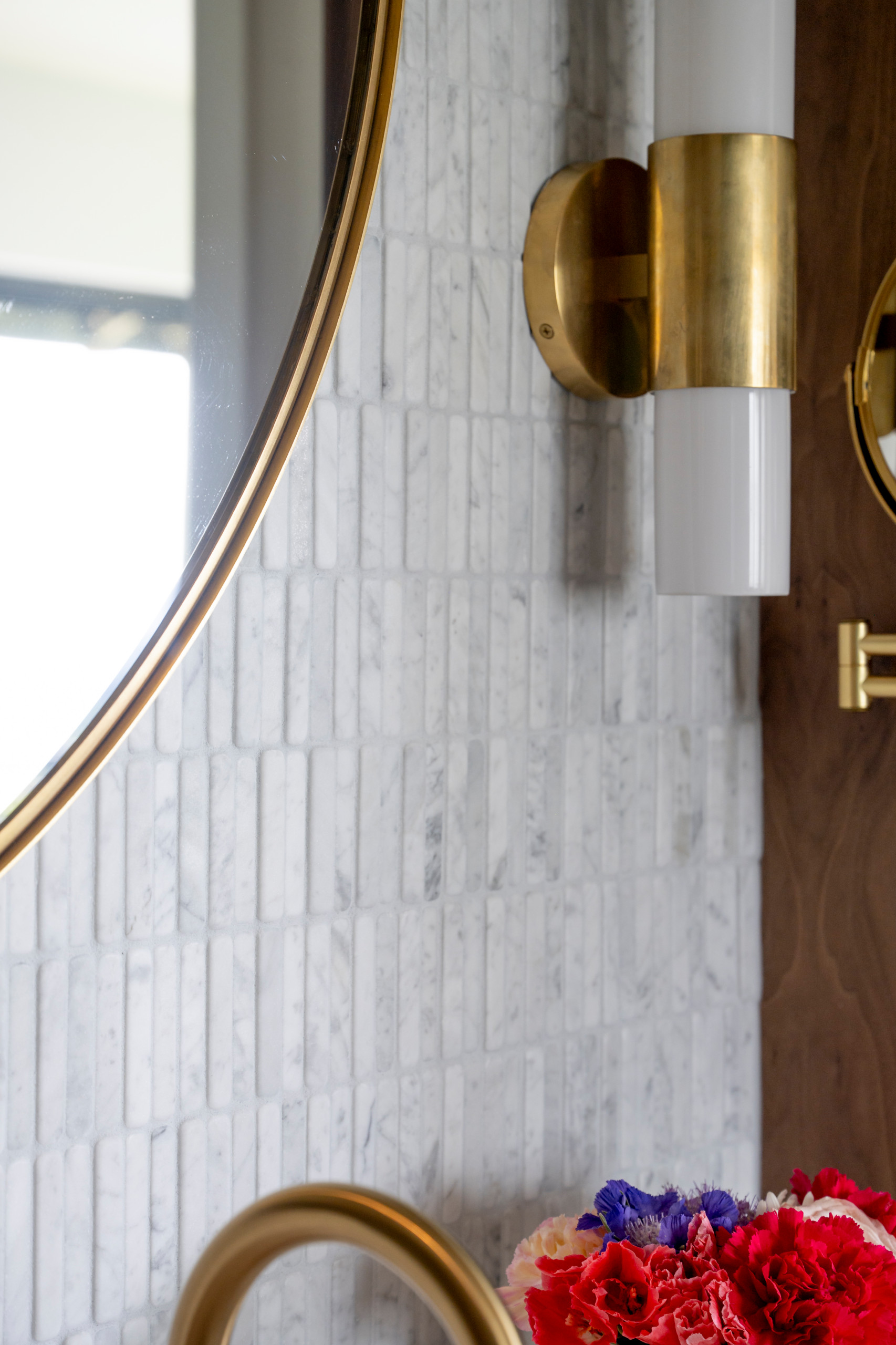 The intricate marble mosaic tile backsplash adds elegance and movement to the vanity wall. Here, the simplicity of the single-hole faucets, conical sconces and round mirror complements the tile rather than competing with it. On the right, Fraley positioned a makeup mirror so the nearby sconce would illuminate that area.