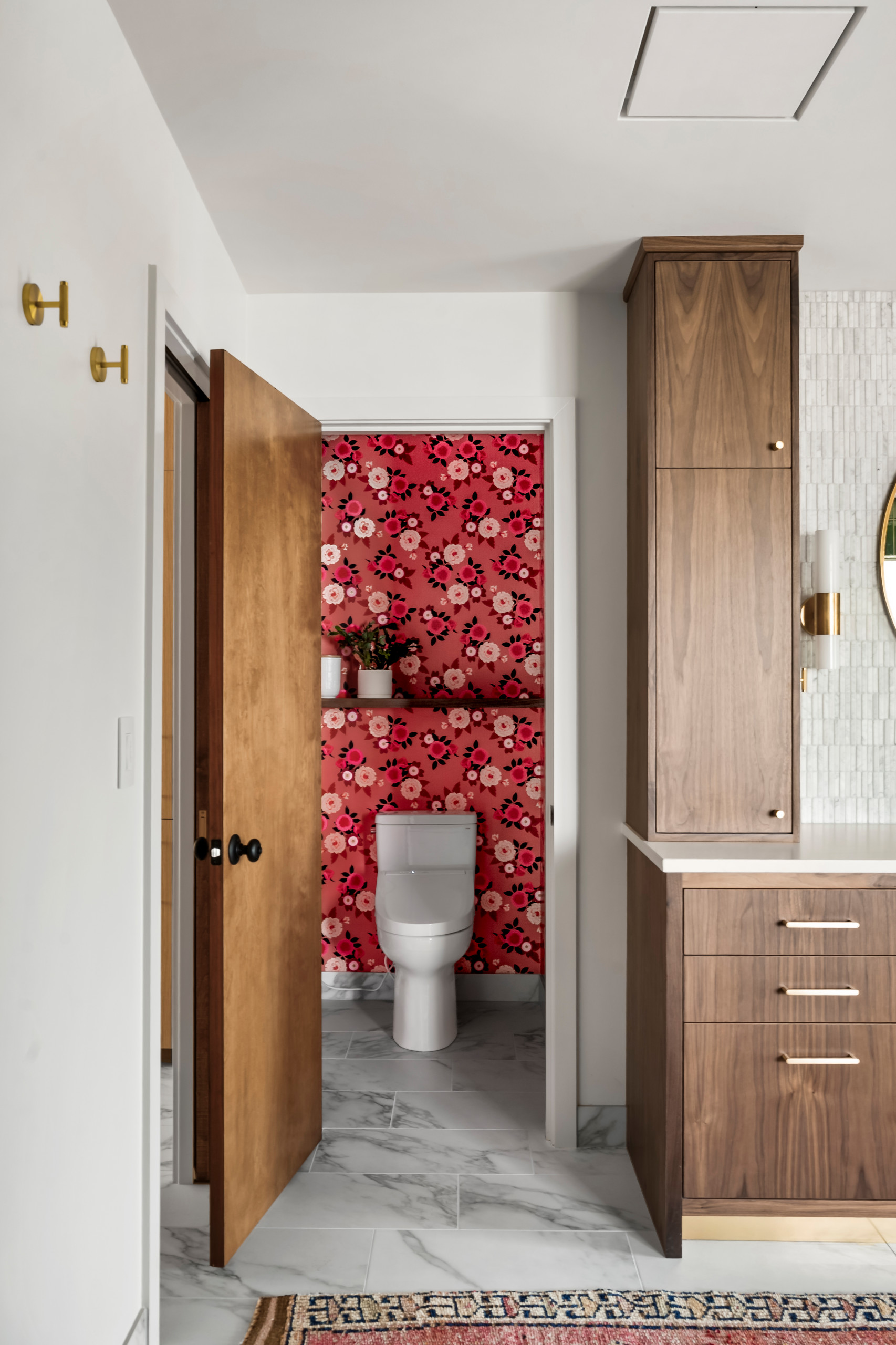 Originally, the wife had hoped for a bathroom entirely clad in pink marble, but the cost and complexity made it impractical. “She said that if she couldn’t have her pink marble bathroom, then we absolutely had to use this wallpaper,” Fraley says. “We certainly got some pink into the room this way.” The wallpaper wraps the walls and ceiling, creating an immersive floral experience in the toilet room.