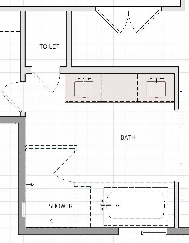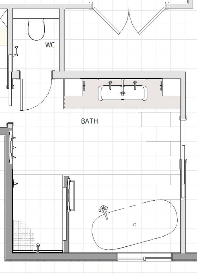 Floor plan (after): While the bathroom footprint remained the same, the layout was refined. New pocket doors on either side of the bathroom and a dividing wall between the tub and shower define the updated plan. Comparing the two layouts shows how removing the double doors allowed Fraley to extend the wall at the bottom right.