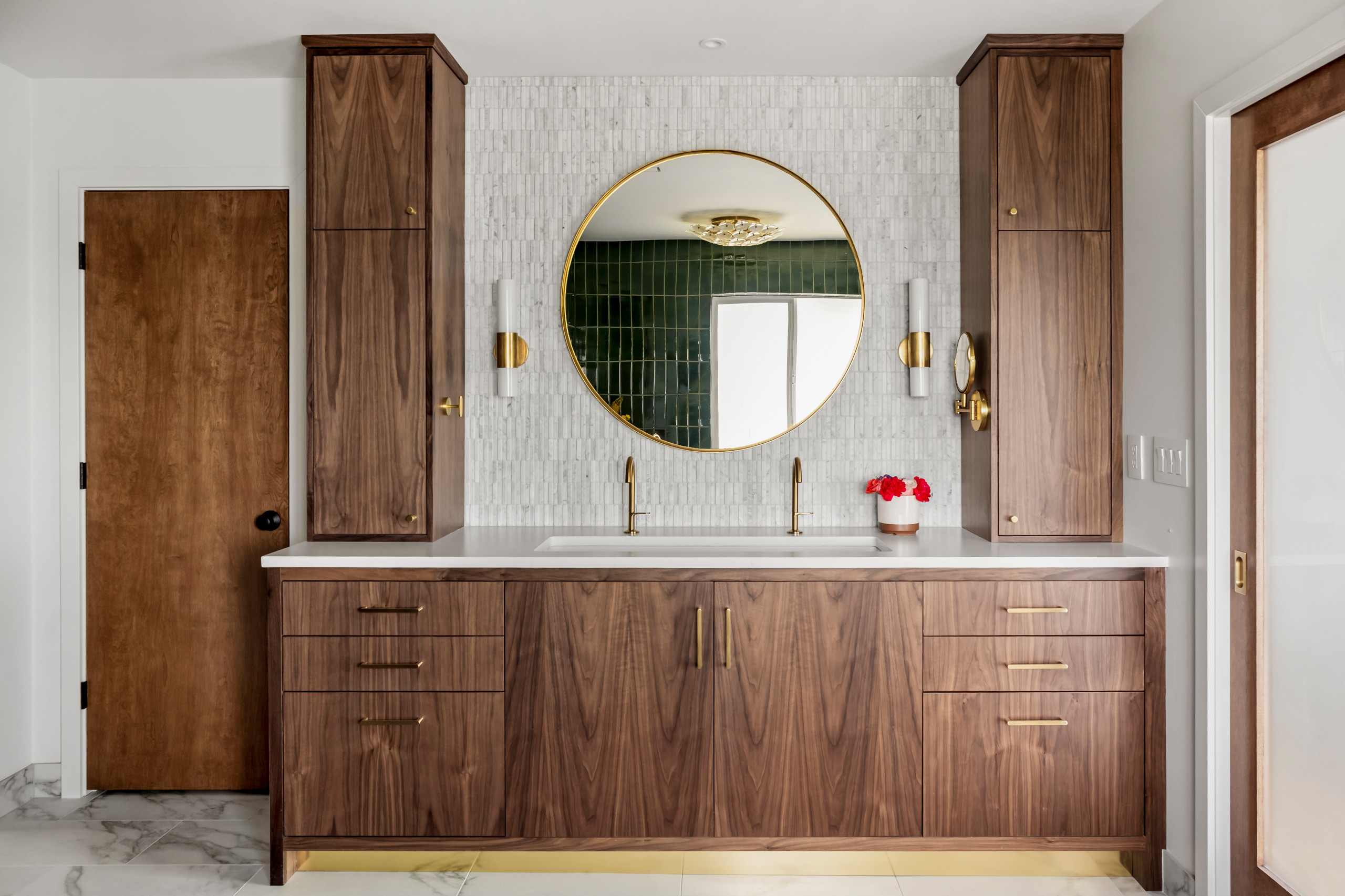 Marble-look quartz countertops coordinate with other marble finishes in the bathroom. The homeowners opted for quartz over real marble for its durability and resistance to water spotting.