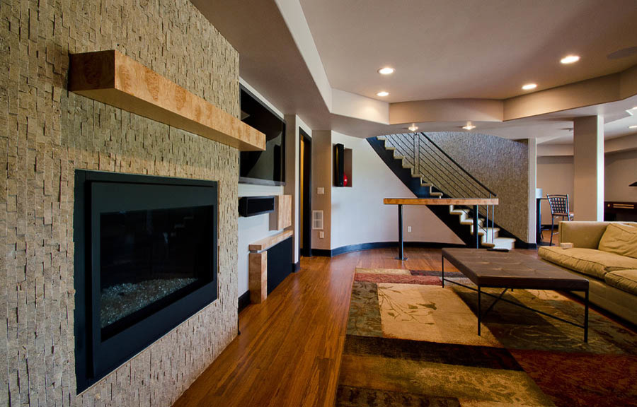 Sebring and other pros say they’re also seeing more modern basement projects that use rustic details, such as the rough wood mantel in this sleek Denver basement.