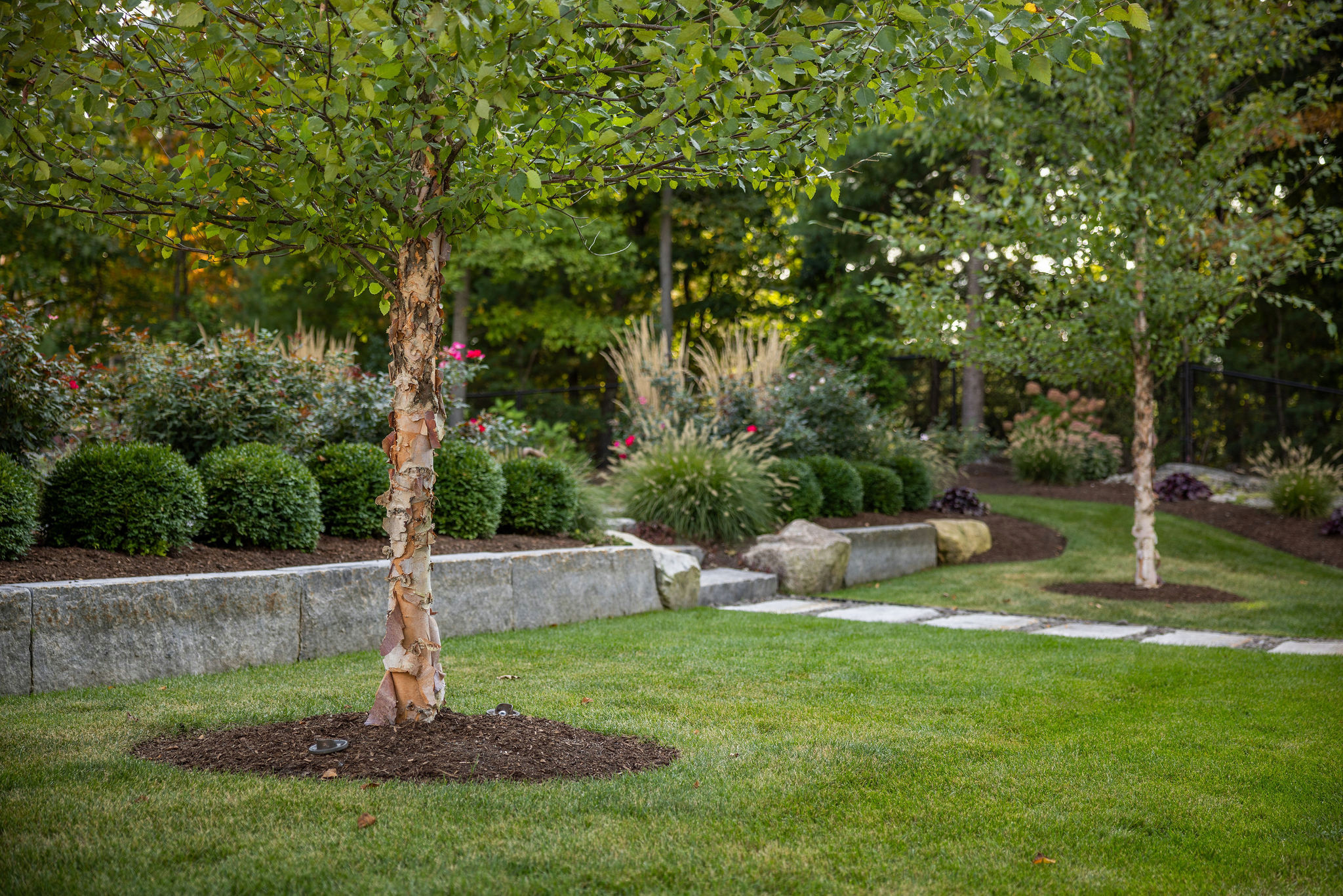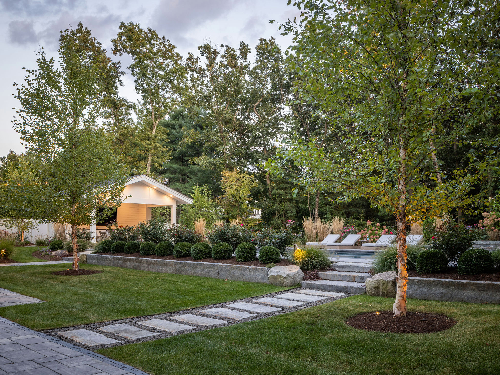 A pair of single-stem river birches (Betula nigra, zones 4 to 9) draws the eye to the lawn between the house and pool terrace. These native trees have beautiful peeling bark that provides year-round interest.