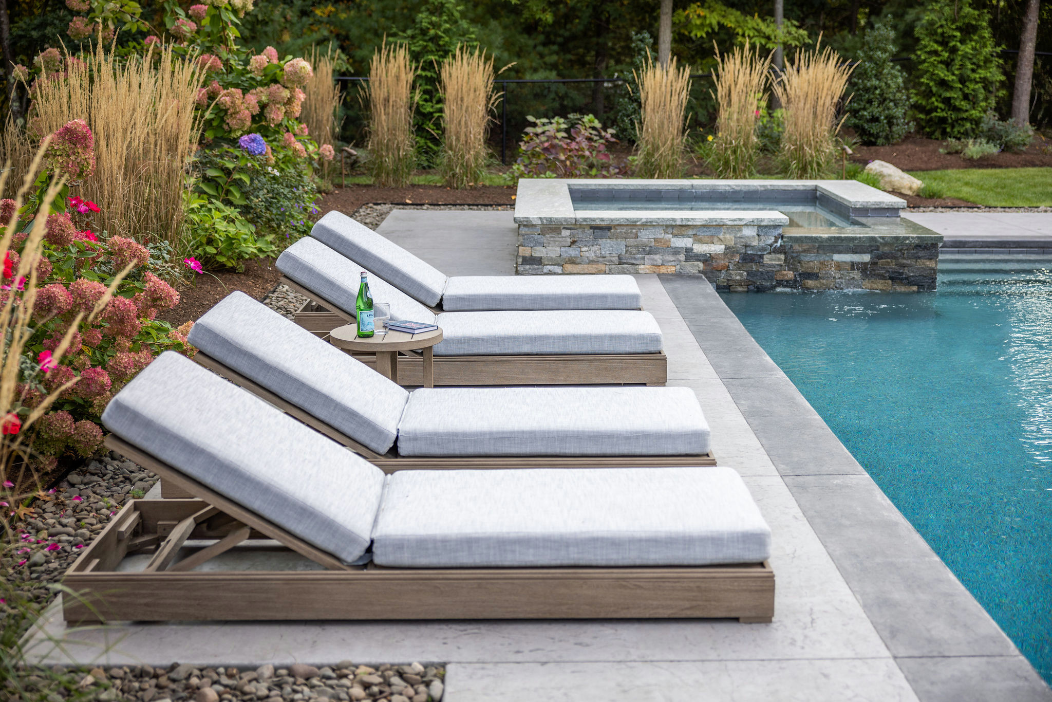 After: Stucchi and the homeowners didn’t want the pool and its surround to take up the entire backyard. Accordingly, he placed it near the back edge of the property. An in-ground spa (seen in the foreground) has a spillover water feature, and the water splashes into the pool for a relaxing sound.