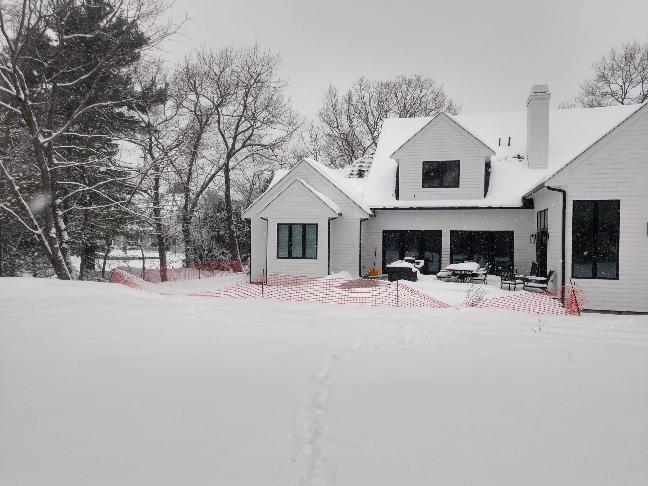 Before: It doesn’t get much more “blank slate” than a landscape covered in snow. This photo was taken when Stucchi and his clients visited the home while it was still on the market. When the clients were trying to figure out if they could install a pool, it was the dead of winter. The only major existing outdoor-living feature was a large deck (which they kept) directly off the back of the house.