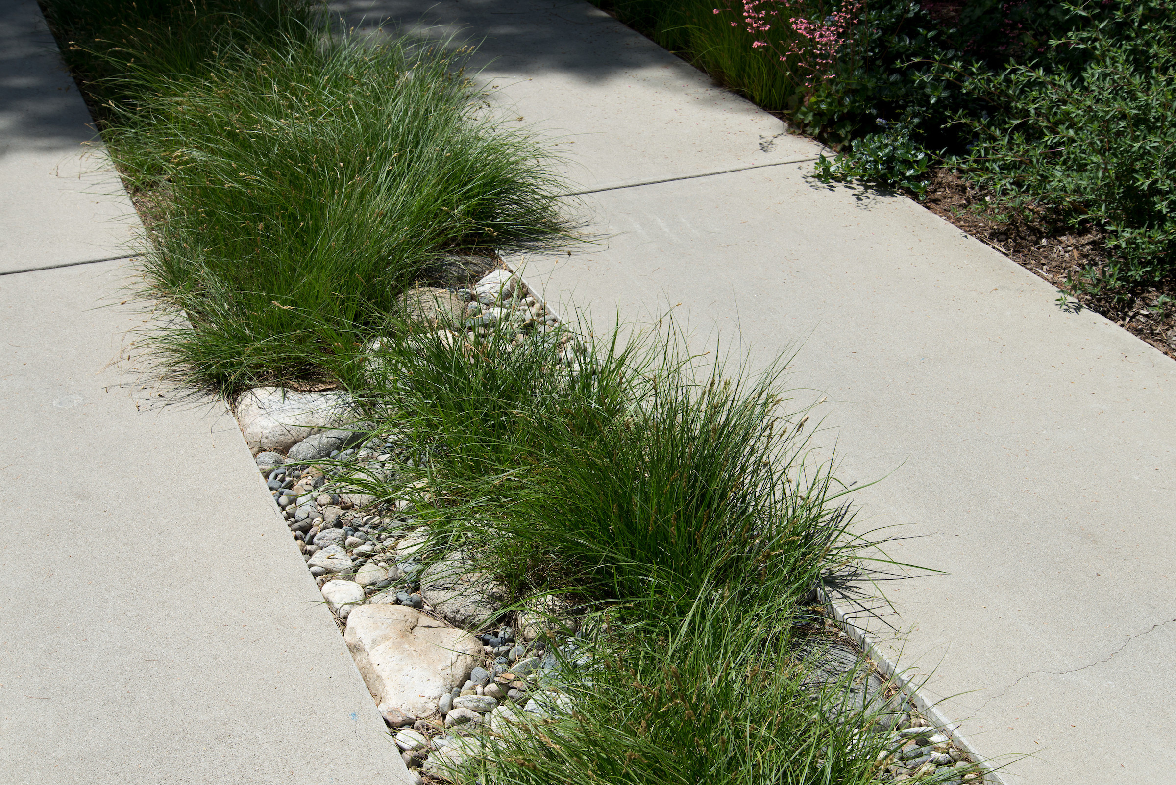A permeable ribbon of sedge and rock now runs down the center of the homeowners’ driveway, replacing what had been a solid concrete pad. The strip beautifies the driveway, which sits adjacent to the front yard, and allows driveway runoff to filter directly back into the ground, rather than flowing into local storm drains.