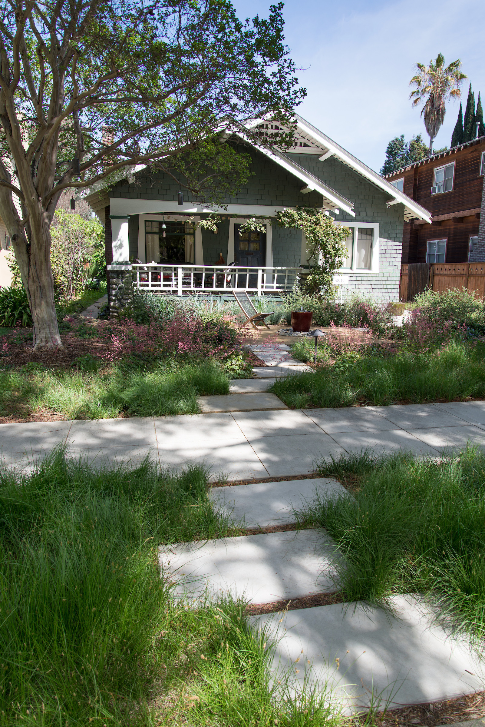 Scott extended the field sedge (Carex praegracilis) and meandering paver path across the sidewalk and into a narrow parking strip in front. “With a smaller garden, I like to treat the parkway as an extension of the main front yard, to make the whole garden feel larger,” she says. The pavers give pedestrians a path to and from their cars.