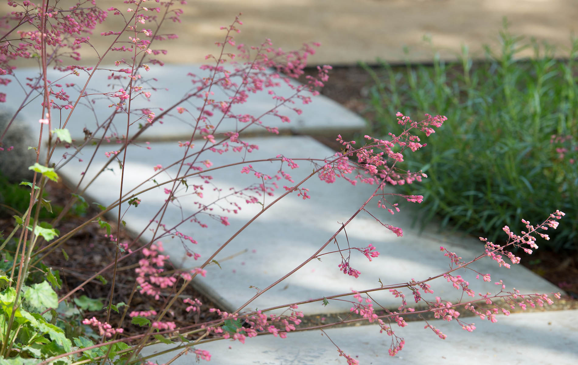 Island alumroot (Heuchera maxima), shown here, produces small pink flowers from late winter into spring. “Like most California native gardens, this one is at its peak in spring. It does look good year-round however, and avoids the drought-deciduous look. The year-round green of the ceanothus and some of the taller grasses keep it looking fresh all year,” Scott says.