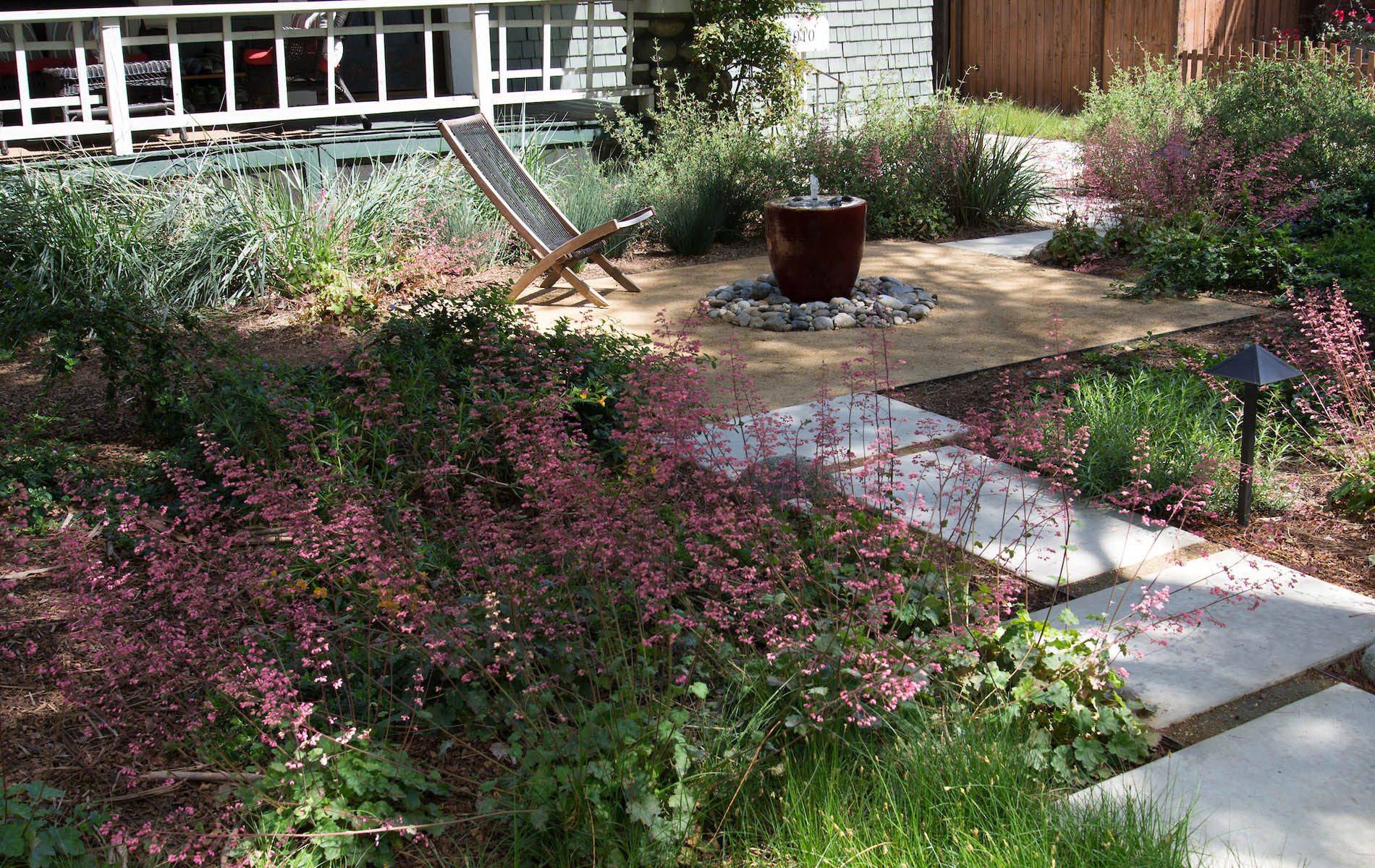The homeowners say their new garden encourages lots of friendly interactions with their neighbors, who like to ask questions and share how much they appreciate the new design. “A few tell us that their dogs always like to walk by to get a drink at the fountain, which leads to more visits and chats,” Jennifer says.