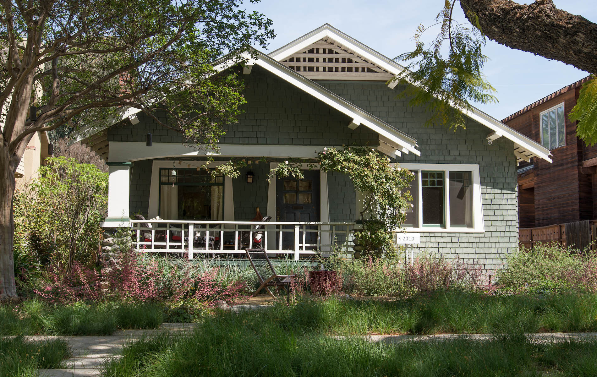 This petite front yard in Los Angeles loses the lawn in favor of low-water native plants and a cozy outdoor seating area
