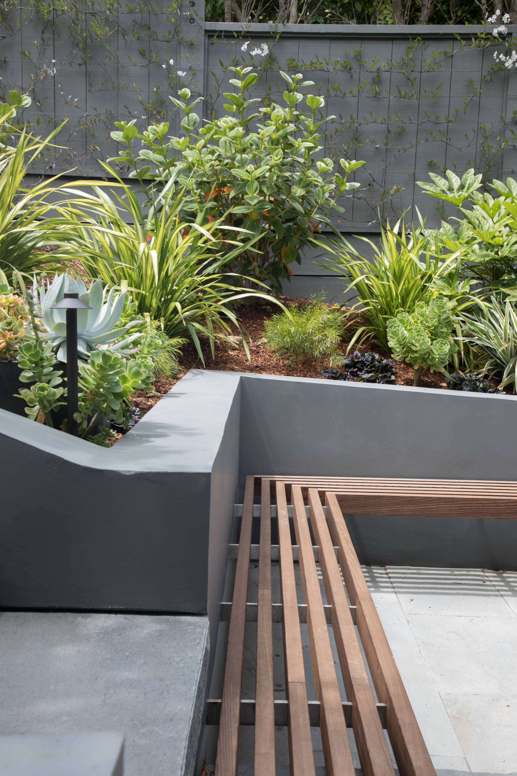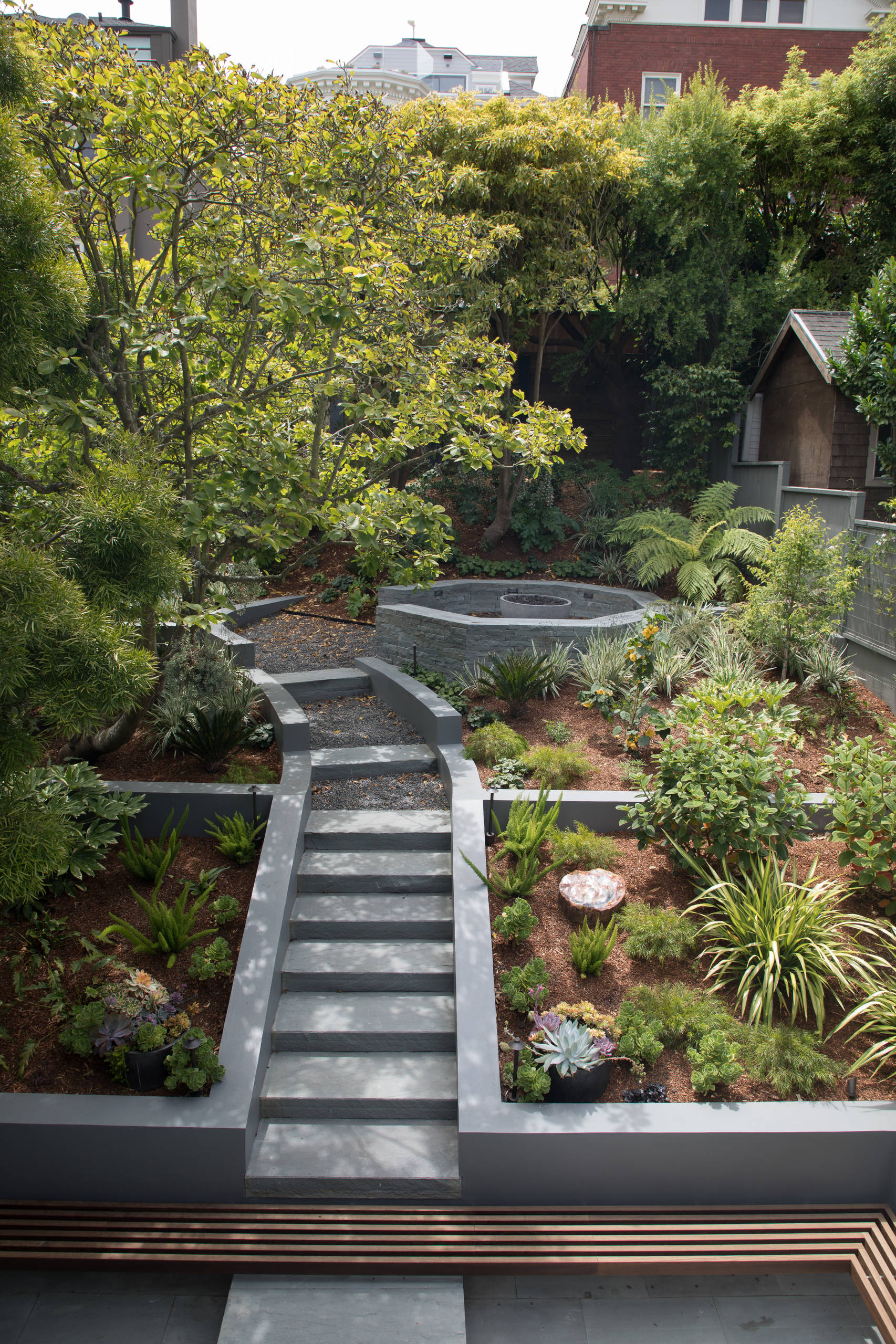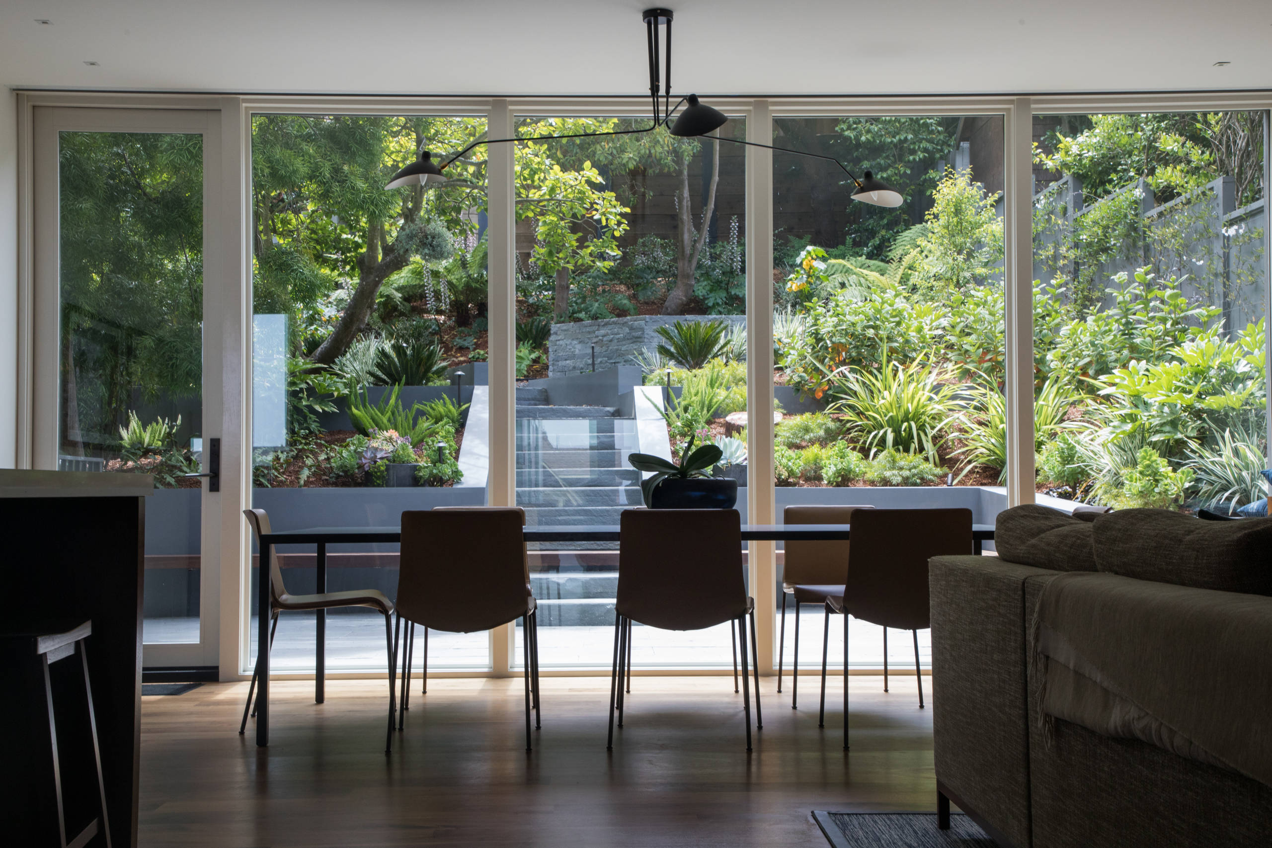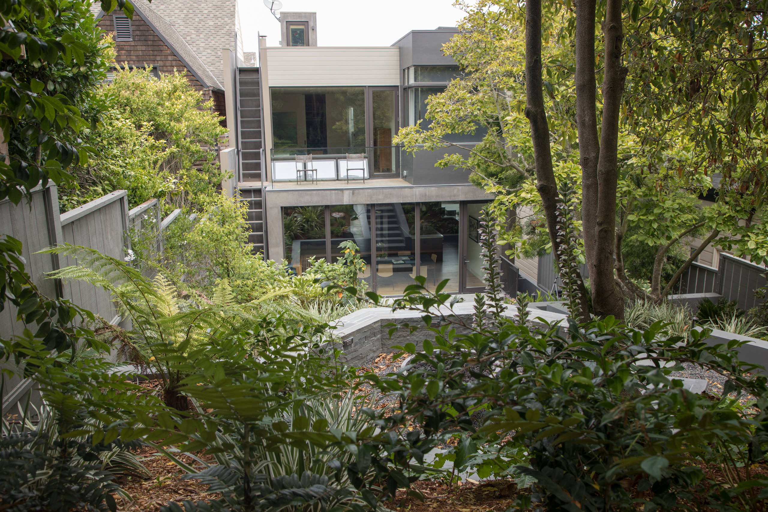 Most of the back of the house is glass, and having the garden provide a beautiful view from inside was one of the most important aspects of the project to the homeowners. Newell centered the outdoor staircase off the center of the indoor dining table, and chose plants with a variety of leaf shapes and sizes that could be seen from indoors.