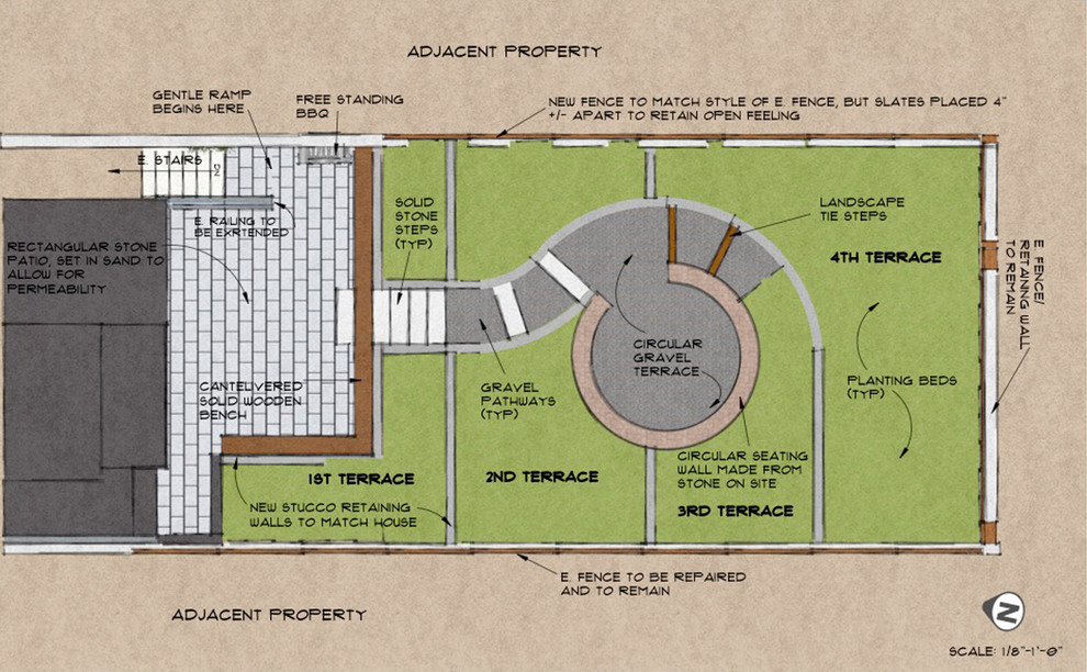 Here’s a plan of the site. Newell organized the yard into four sections, divided by retaining walls. The homeowners “wanted the kids to be able to play and run around anywhere they wanted back here. I designed it so that nothing in the planting beds was too precious,” she says.