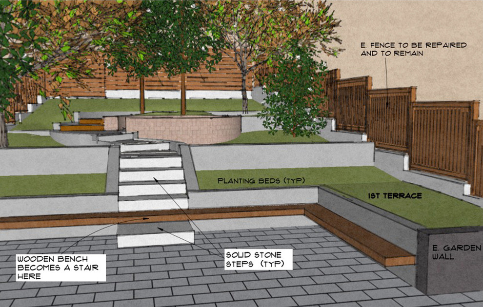 The designer composed an extensive grading plan that pushed the slope back to make room for a larger patio directly off the house. It also allowed for a flat area at the top of the hill with a fire pit surrounded by a seating wall. She created gently sloped terraces between the two with retaining walls.