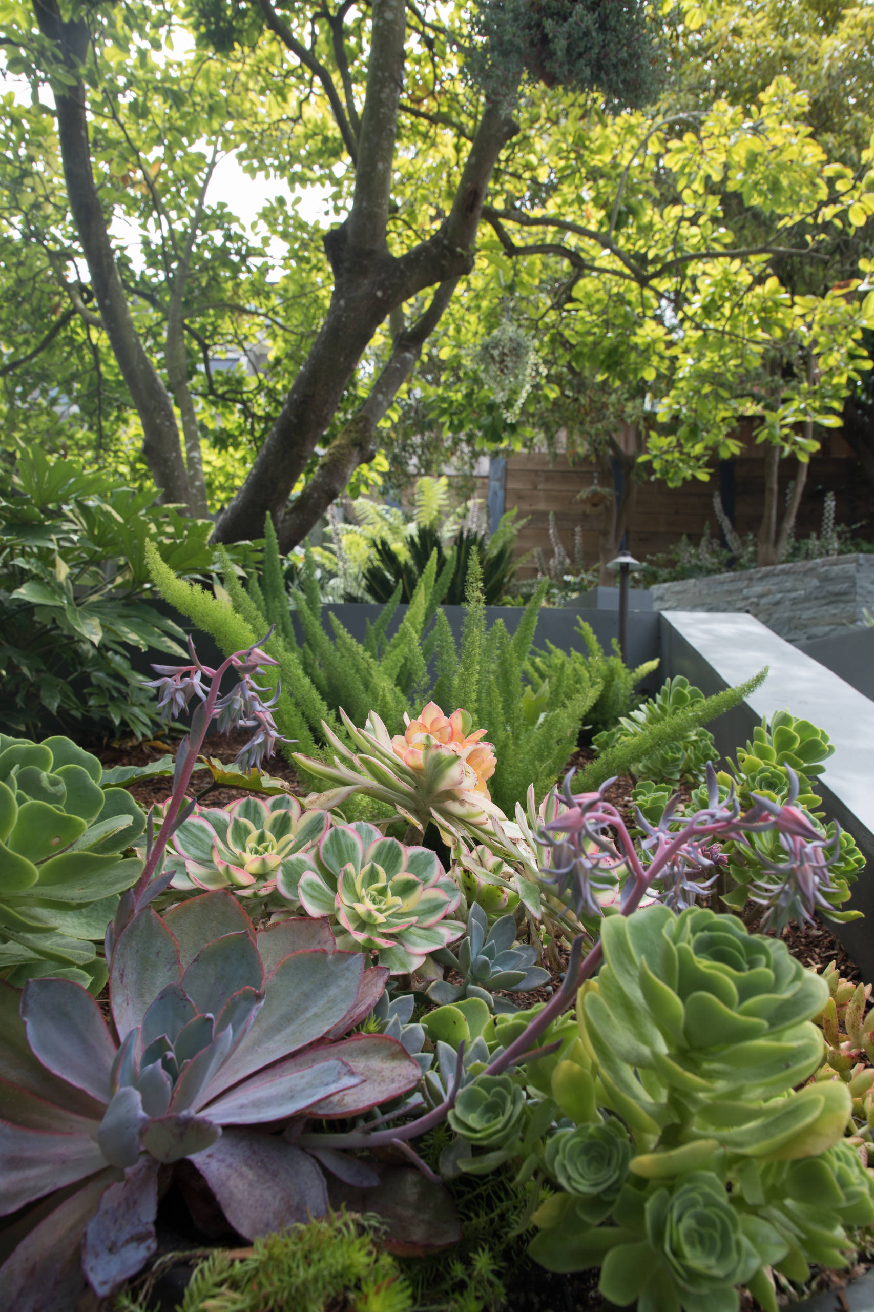 The succulents from the planters can be seen in the foreground here. They include ‘Kiwi’ aeonium (Aeonium ‘Kiwi’, USDA zones 9 to 11; find your zone), ‘Jolly Green’ aeonium (Aeonium ‘Jolly Green’, zones 9 to 11), Afterglow echeveria (Echeveria ‘Afterglow’, zones 9 to 11) and chalk dudleya (Dudleya pulverulenta, zones 9 to 11).