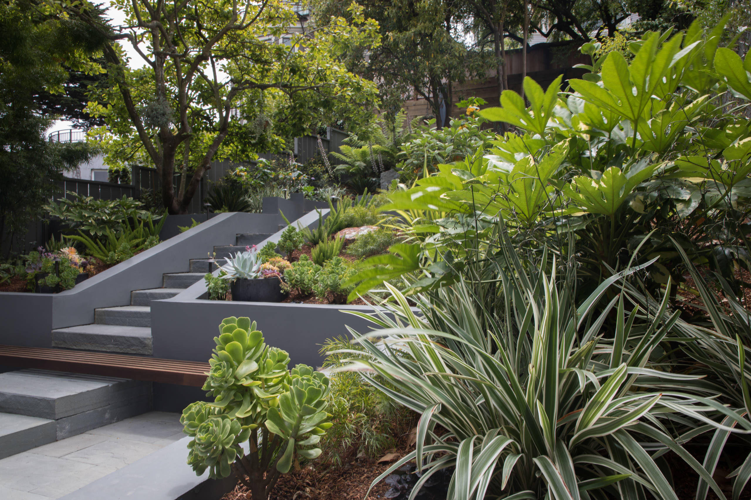 A landscape designer terraces a steep slope in San Francisco, creating beautiful views and inviting spaces