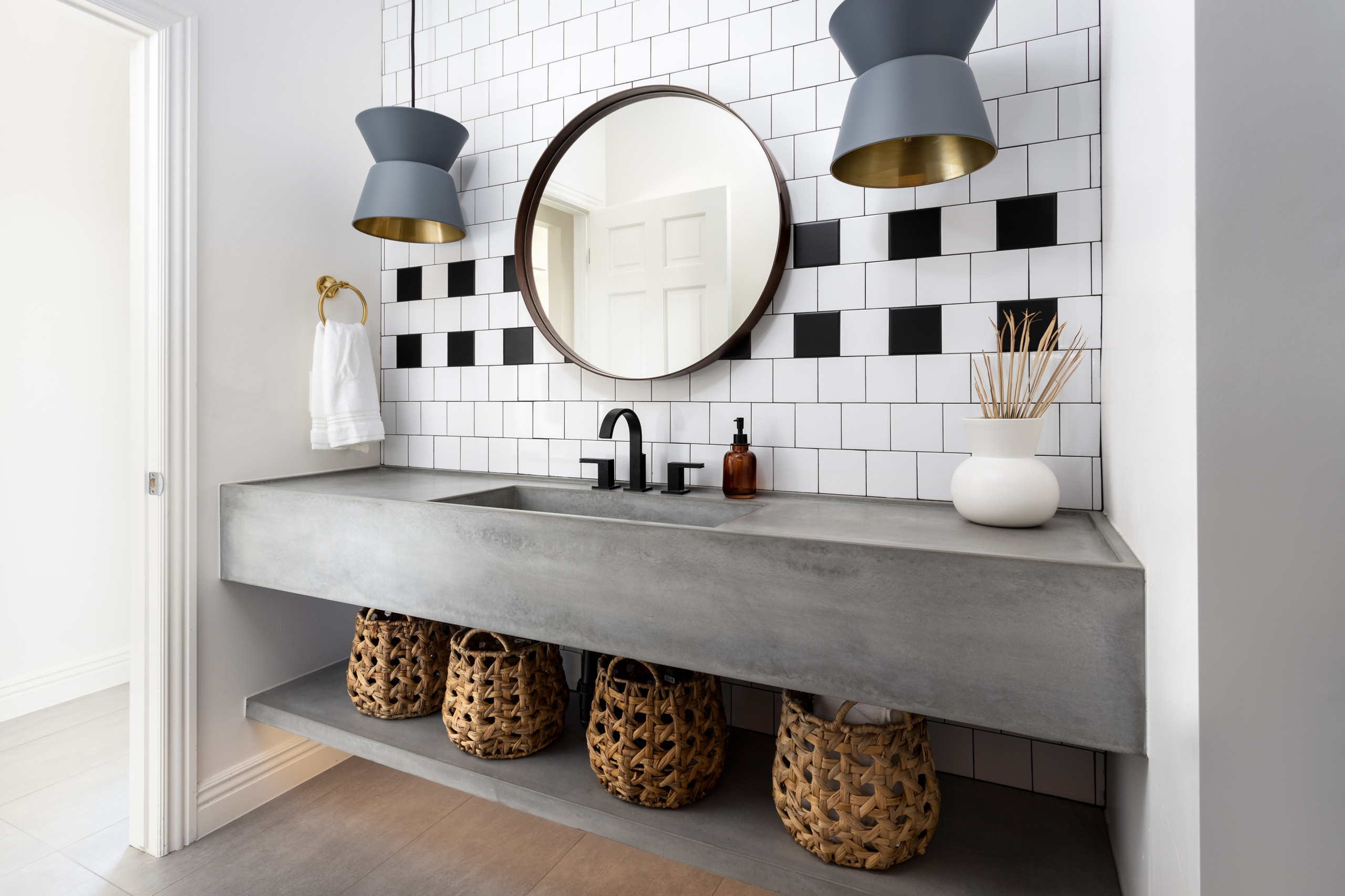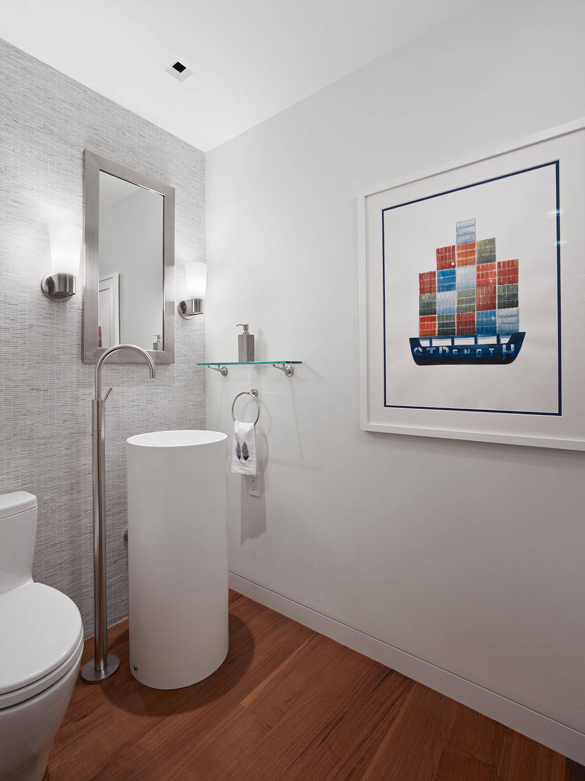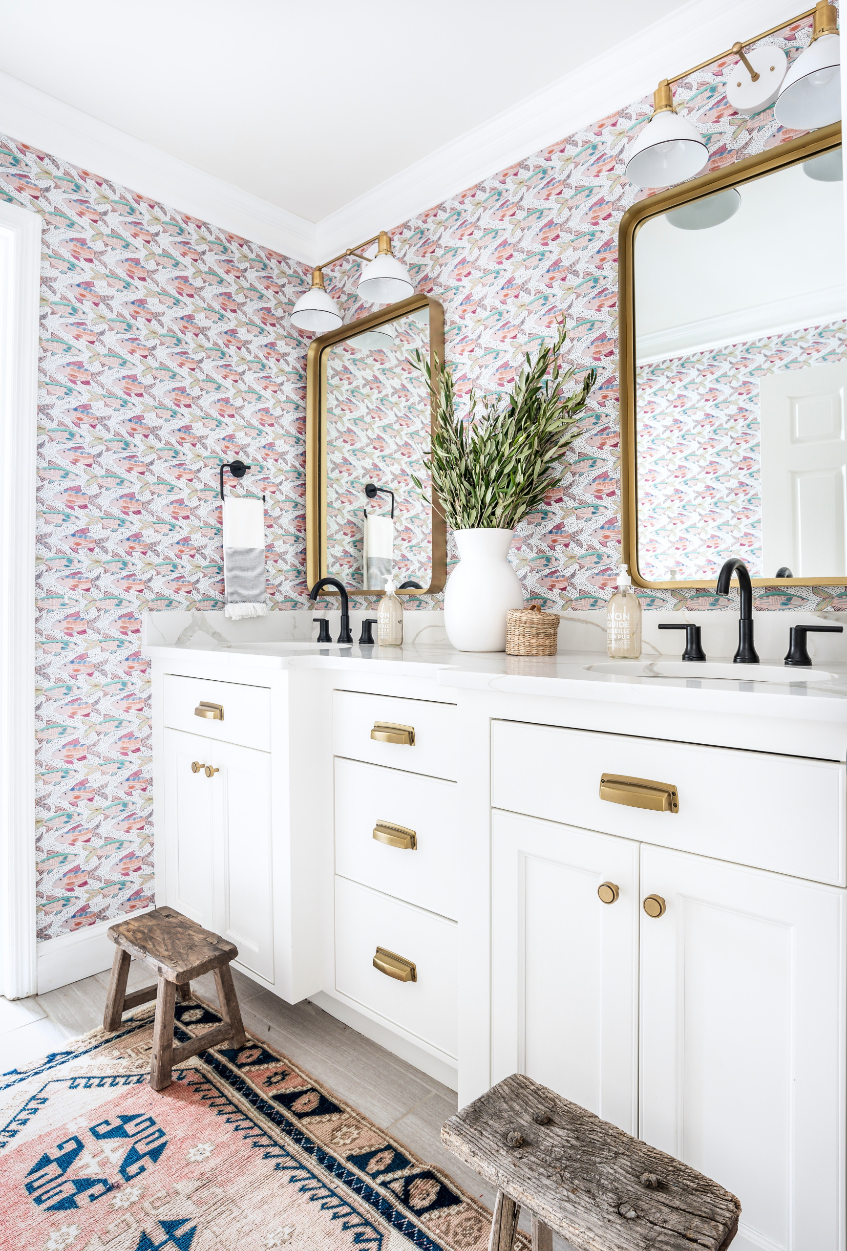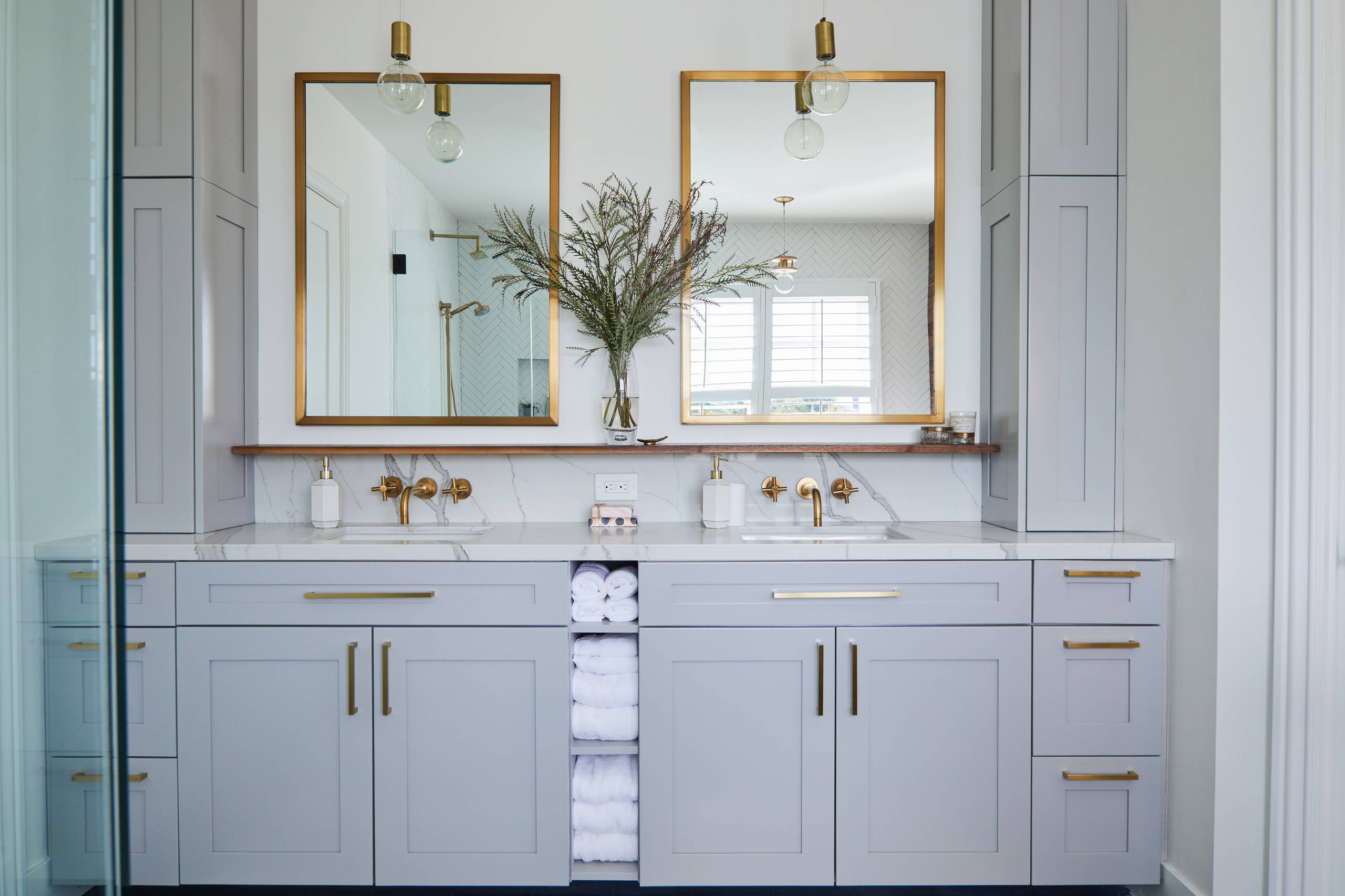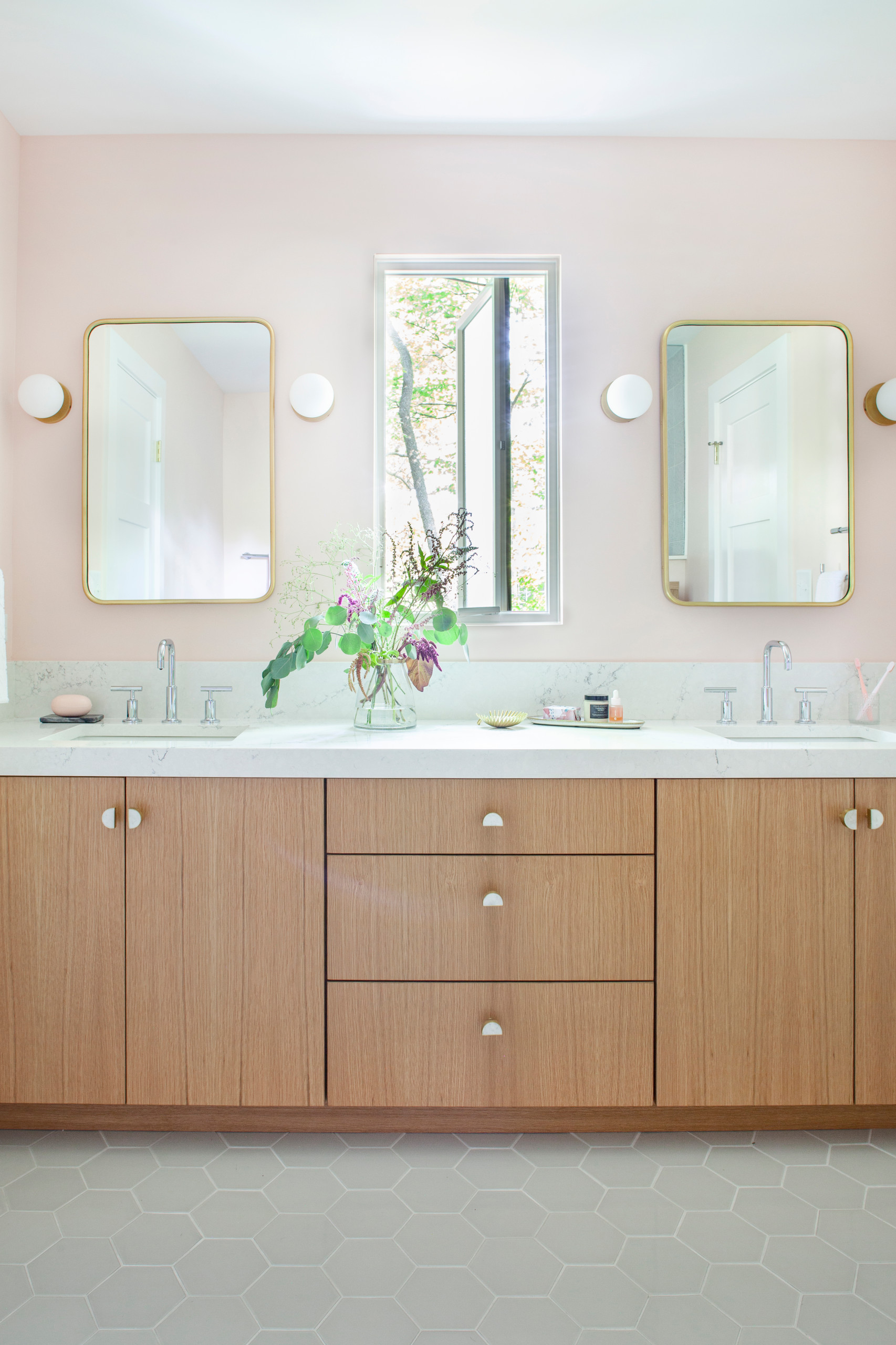 One trick is to use the same finish on the same horizontal plane. Designer Susan Klimala of The Kitchen Studio mixed metals in this way to connect disparate elements in this bathroom for two young girls: Chrome faucets and towel racks at midheight tie in with the gray floor tile, while brass on the mirrors, light fixtures and cabinet hardware work with the blush pink walls (Benjamin Moore’s Love & Happiness) and the quarter-sawn white oak veneer on the vanity.