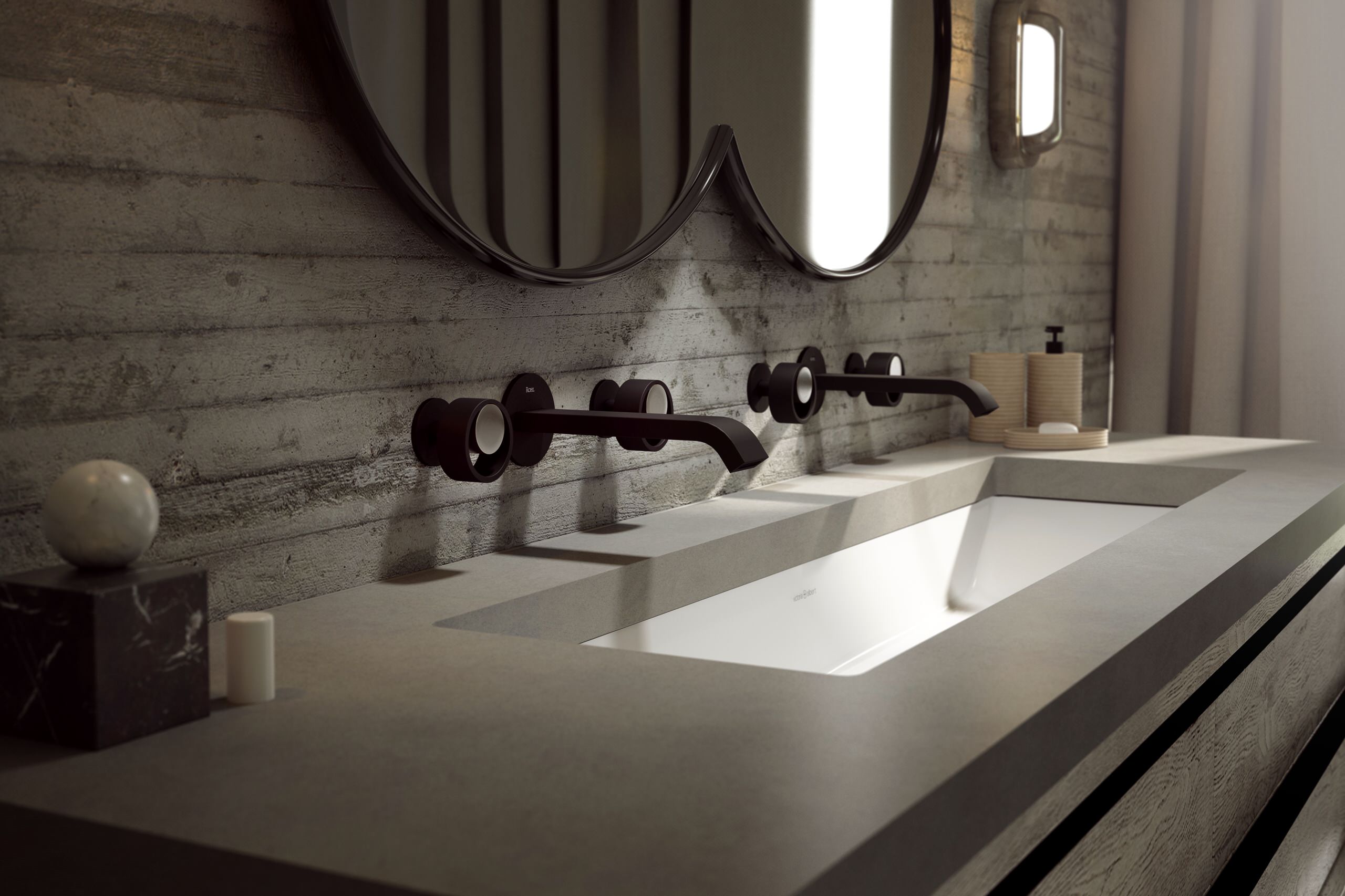 A two-tone (aka split) finish can facilitate mixing. The customizable sink faucets in Rohl’s new Eclissi bath collection are designed so that the spout and handle’s outer ring are one finish, while the handle’s inner circle can be another. Polished chrome, satin nickel, matte black and satin gold mix and match for a total of 16 combinations. These wall-mounted Eclissi faucets contrast matte black with satin nickel accents.